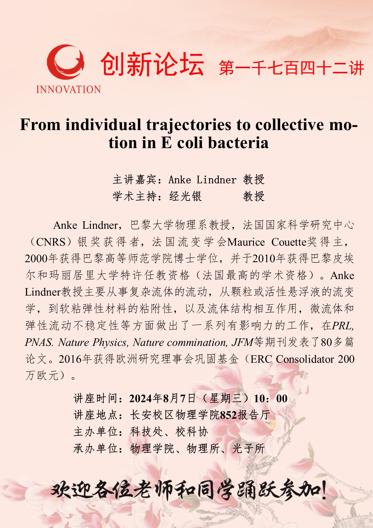 Anke Lindner 教授 welcome欢迎光临威尼斯集团创新论坛第一千七百四十二讲:From individual trajectories to collective motion in E coli bacteria 讲座时间 2024年8月7日(星期三)10:00 讲座地点 长安校区物理学院852报告厅 讲座人介绍 Anke Lindner 教授 讲座内容
