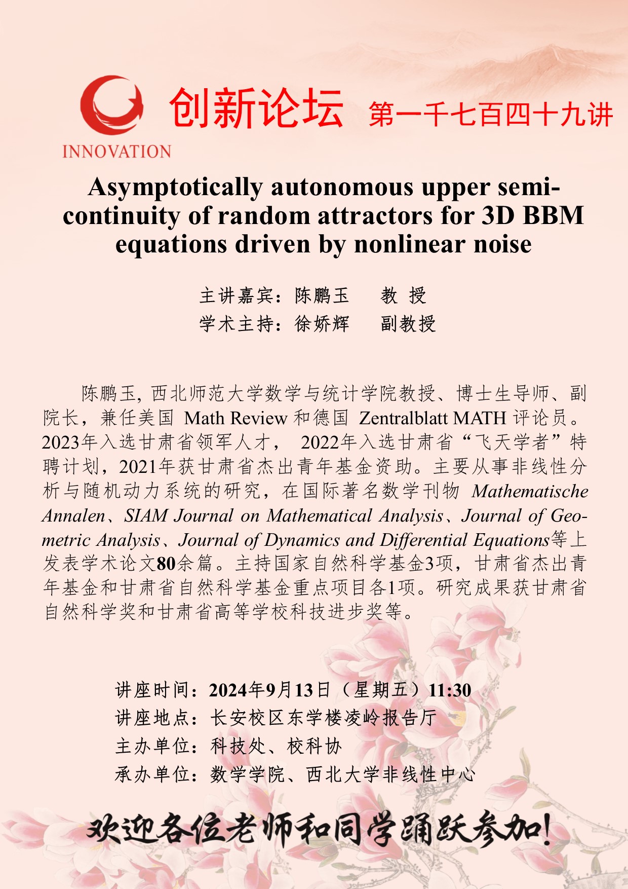 陈鹏玉 教授 welcome欢迎光临威尼斯集团创新论坛第一千七百四十九讲:Asymptotically autonomous upper semi-continuity of random attractors for 3D BBM equations driven by nonlinear noise 讲座时间 2024年9月13日(星期五)11:30 讲座地点 长安校区东学楼凌岭报告厅 讲座人介绍 陈鹏玉 教授 讲座内容