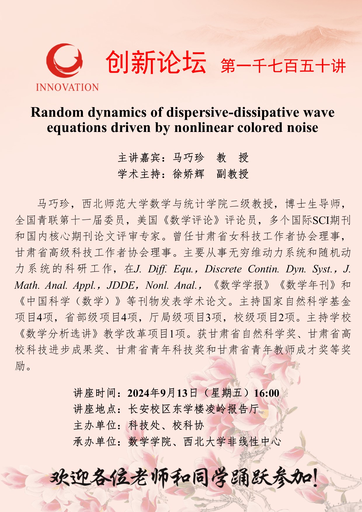 马巧珍 教授 welcome欢迎光临威尼斯集团创新论坛第一千七百五十讲:Random dynamics of dispersive-dissipative wave equations driven by nonlinear colored noise 讲座时间 2024年9月13日(星期五)16:00 讲座地点 长安校区东学楼凌岭报告厅 讲座人介绍 马巧珍 教授 讲座内容