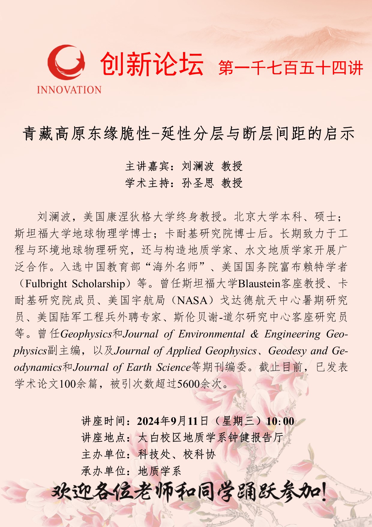 刘澜波 教授 welcome欢迎光临威尼斯集团创新论坛第一千七百五十四讲:青藏高原东缘脆性-延性分层与断层间距的启示 讲座时间 2024年9月11日(星期三)10:00 讲座地点 太白校区地质学系钟健报告厅 讲座人介绍 刘澜波 教授 讲座内容