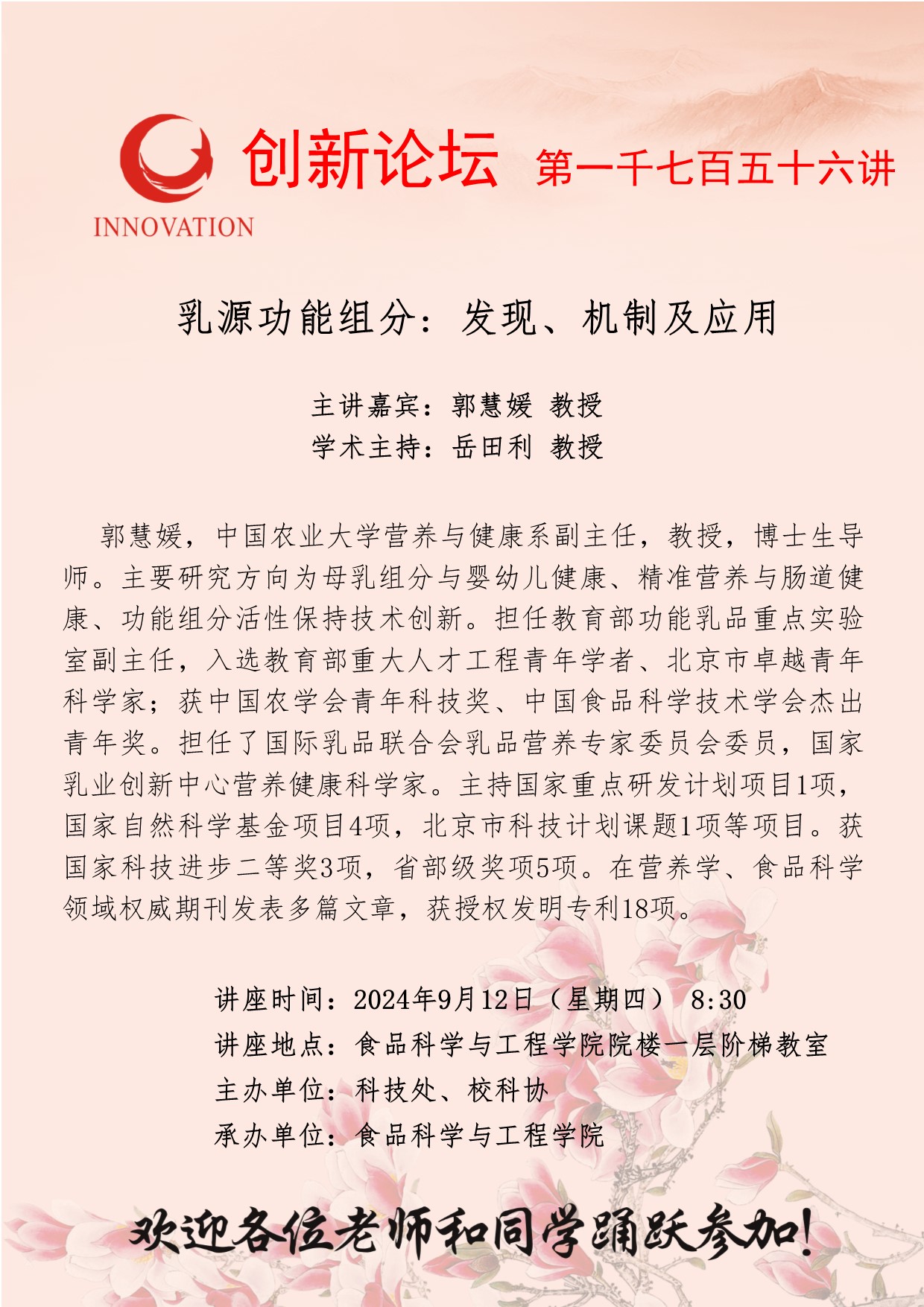 郭慧媛 教授 welcome欢迎光临威尼斯集团创新论坛第一千七百五十六讲: 乳源功能组分: 发现、机制及应用 讲座时间 2024年9月12日(星期四) 8:30 讲座地点 食品科学与工程学院院楼一层阶梯教室 讲座人介绍 郭慧媛 教授 讲座内容