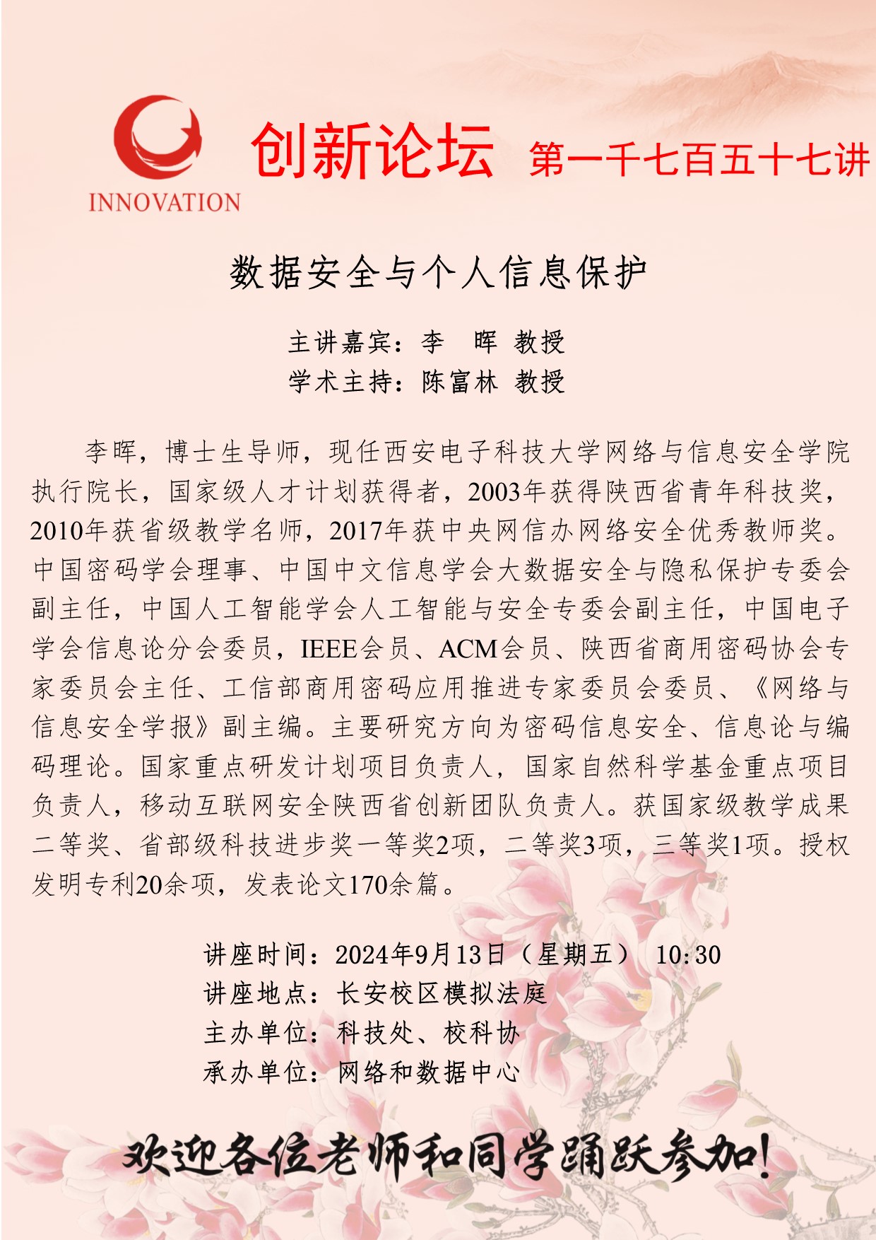 李晖 教授 welcome欢迎光临威尼斯集团创新论坛第一千七百五十七讲:数据安全与个人信息保护 讲座时间 2024年9月13日(星期五) 10:30 讲座地点 长安校区模拟法庭 讲座人介绍 李晖 教授 讲座内容
