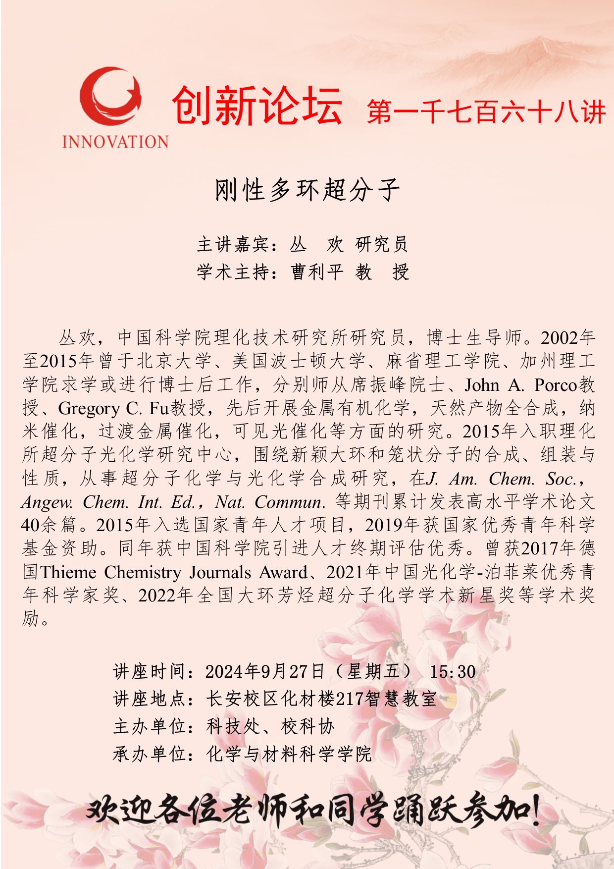 丛欢 研究员 welcome欢迎光临威尼斯集团创新论坛第一千七百六十八讲:刚性多环超分子 讲座时间 2024年9月27日(星期五) 15:30 讲座地点 长安校区化材楼217智慧教室 讲座人介绍 丛欢 研究员 讲座内容