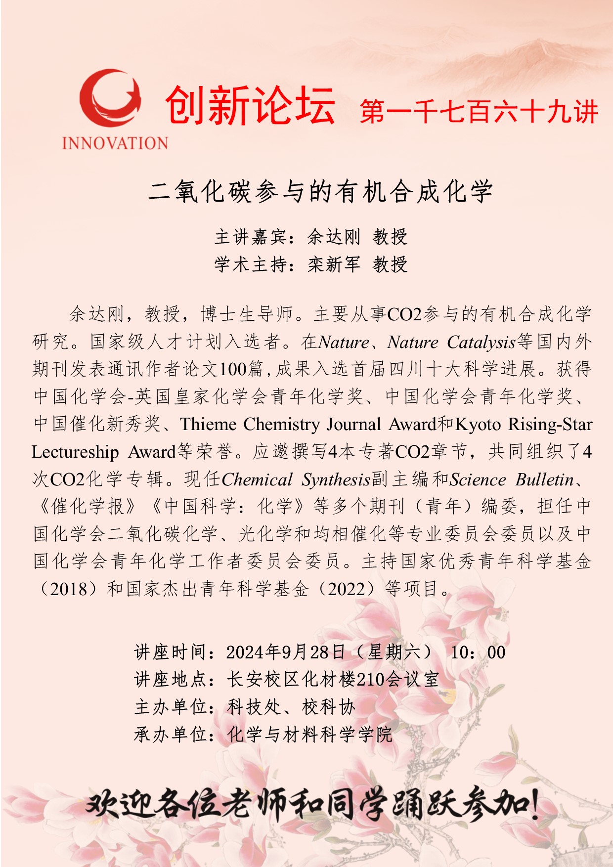 余达刚 教授 welcome欢迎光临威尼斯集团创新论坛第一千七百六十九讲:二氧化碳参与的有机合成化学 讲座时间 2024年9月28日(星期六) 10:00 讲座地点 长安校区化材楼210会议室 讲座人介绍 余达刚 教授 讲座内容