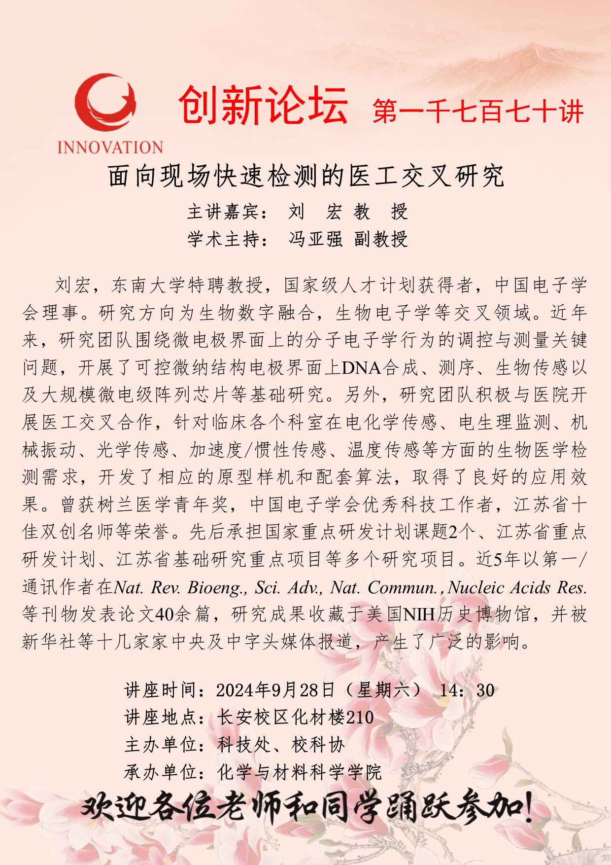 刘宏 教授 welcome欢迎光临威尼斯集团创新论坛第一千七百七十讲:面向现场快速检测的医工交叉研究 讲座时间 2024年9月28日(星期六) 14:30 讲座地点 长安校区化材楼210 讲座人介绍 刘宏 教授 讲座内容