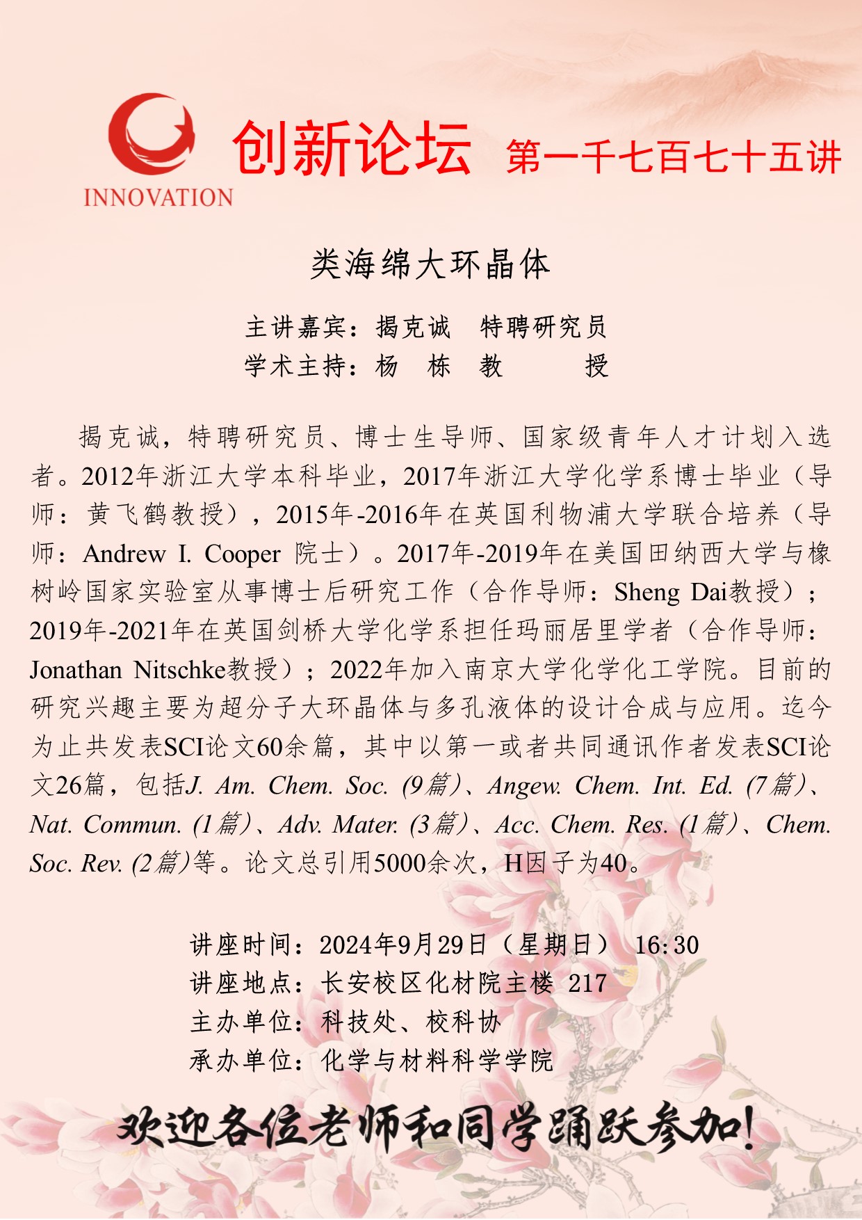 揭克诚 特聘研究员 welcome欢迎光临威尼斯集团创新论坛第一千七百七十五讲:类海绵大环晶体 讲座时间 2024年9月29日(星期日) 16:30 讲座地点 长安校区化材院主楼 217 讲座人介绍 揭克诚 特聘研究员 讲座内容
