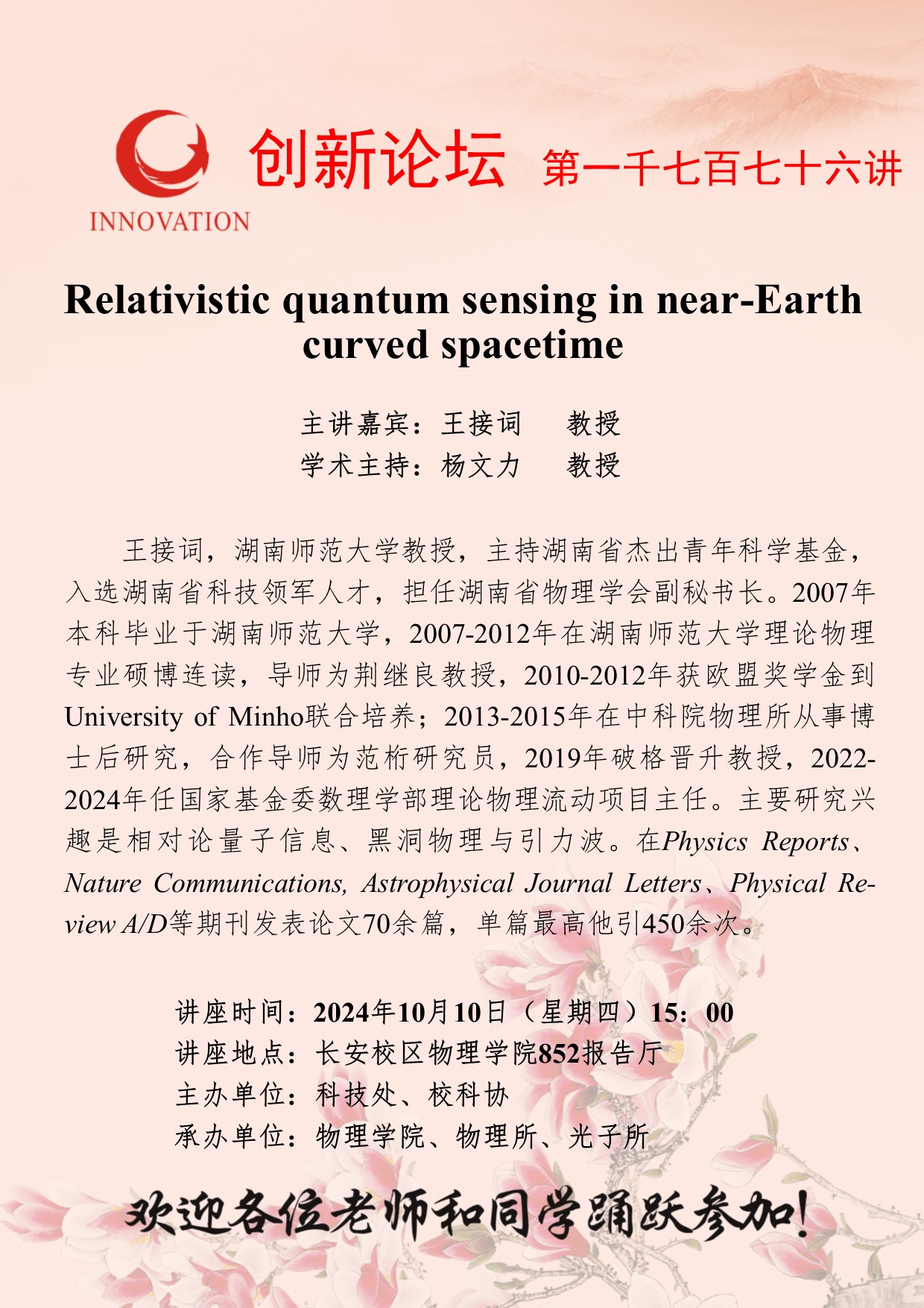 王接词 教授 welcome欢迎光临威尼斯集团创新论坛第一千七百七十六讲:Relativistic quantum sensing in near-Earth curved spacetime 讲座时间 2024年10月10日(星期四)15:00 讲座地点 长安校区物理学院852报告厅 讲座人介绍 王接词 教授 讲座内容