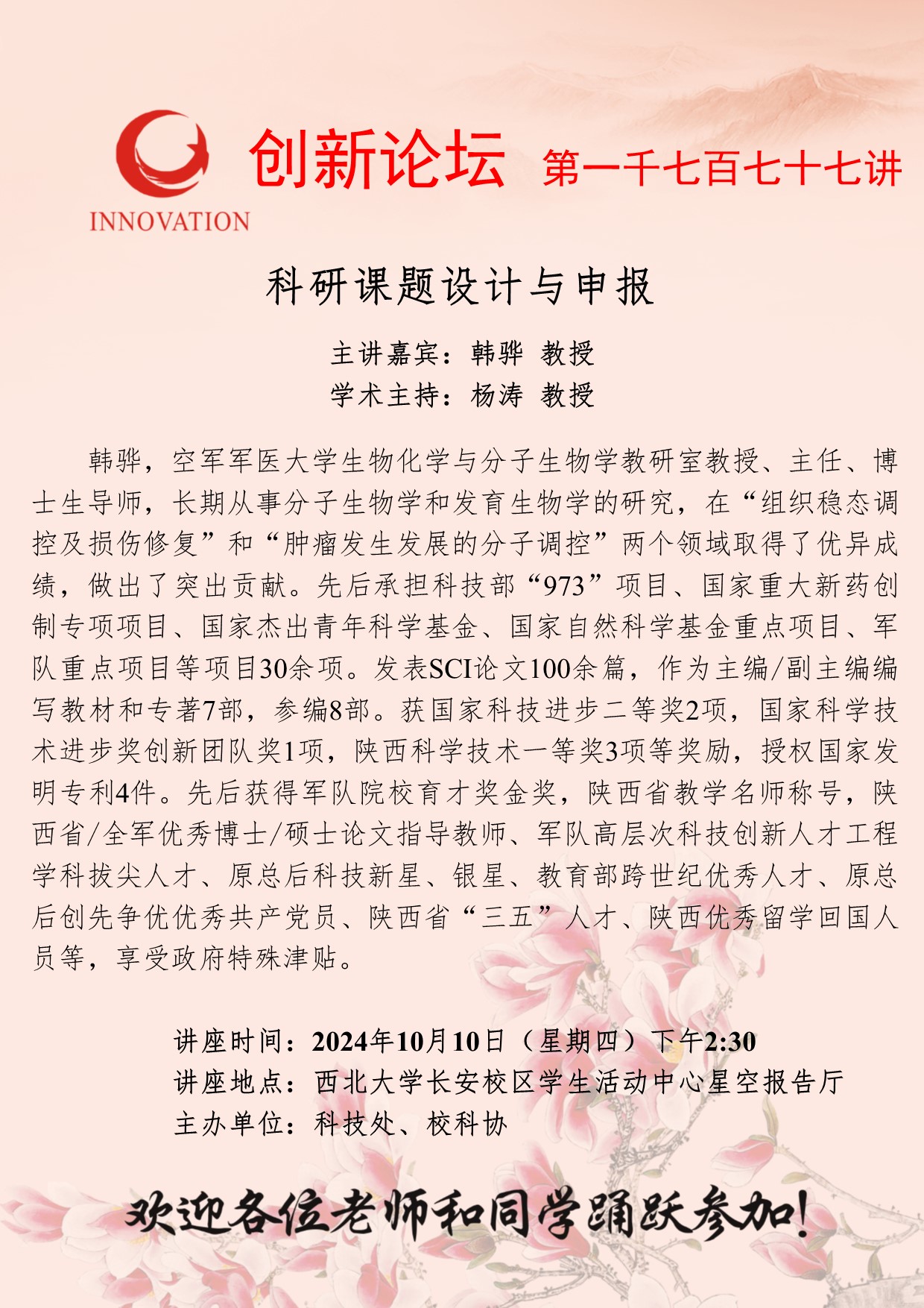 韩骅 教授 welcome欢迎光临威尼斯集团创新论坛第一千七百七十七讲:科研课题设计与申报 讲座时间 2024年10月10日(星期四)下午2:30 讲座地点 welcome欢迎光临威尼斯集团长安校区学生活动中心星空报告厅 讲座人介绍 韩骅 教授 讲座内容
