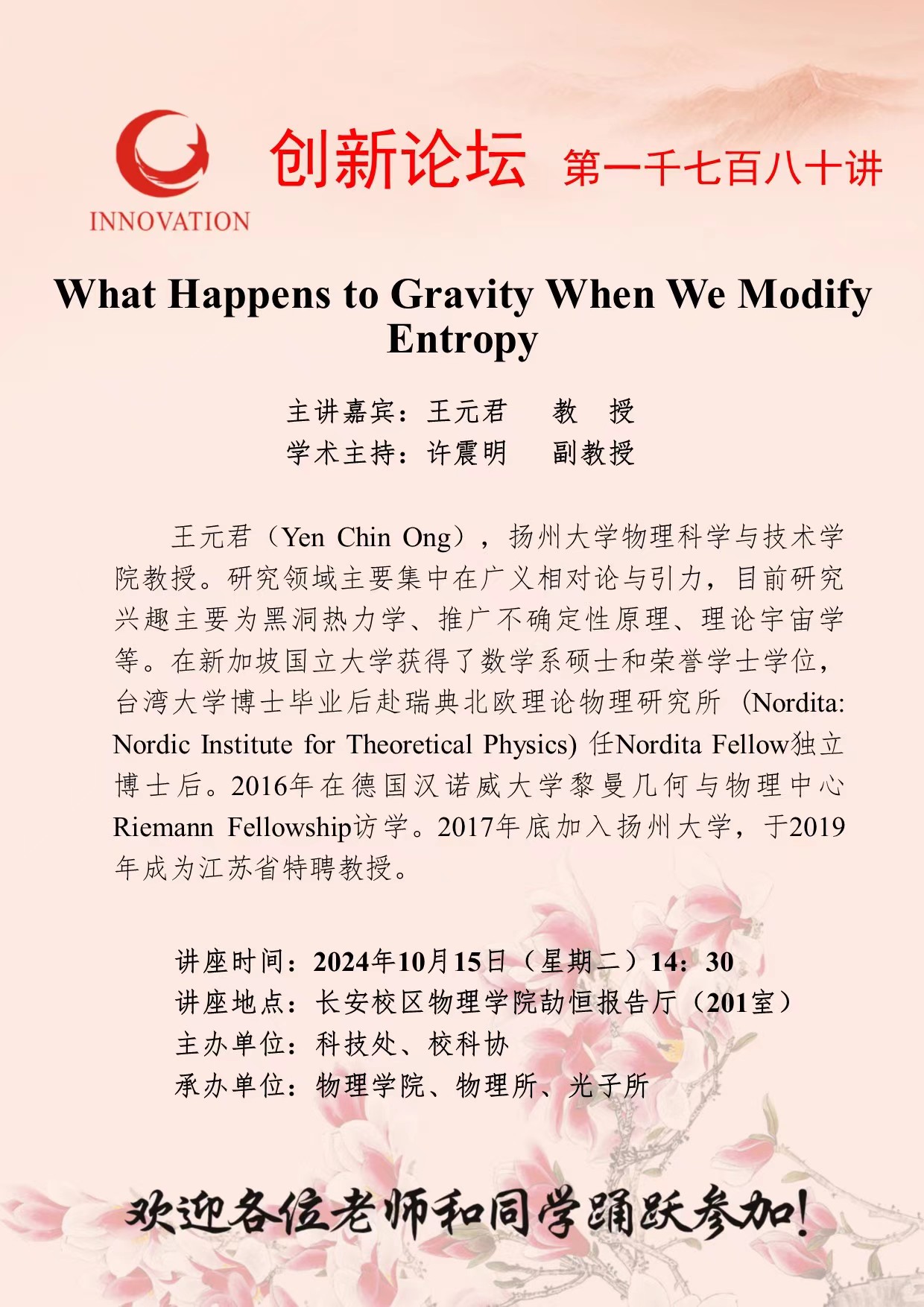 王元君 教授 welcome欢迎光临威尼斯集团创新论坛第一千七百八十讲:What Happens to Gravity When We Modify Entropy 讲座时间 2024年10月15日(星期二)14:30 讲座地点 长安校区物理学院劼恒报告厅(201室) 讲座人介绍 王元君 教授 讲座内容