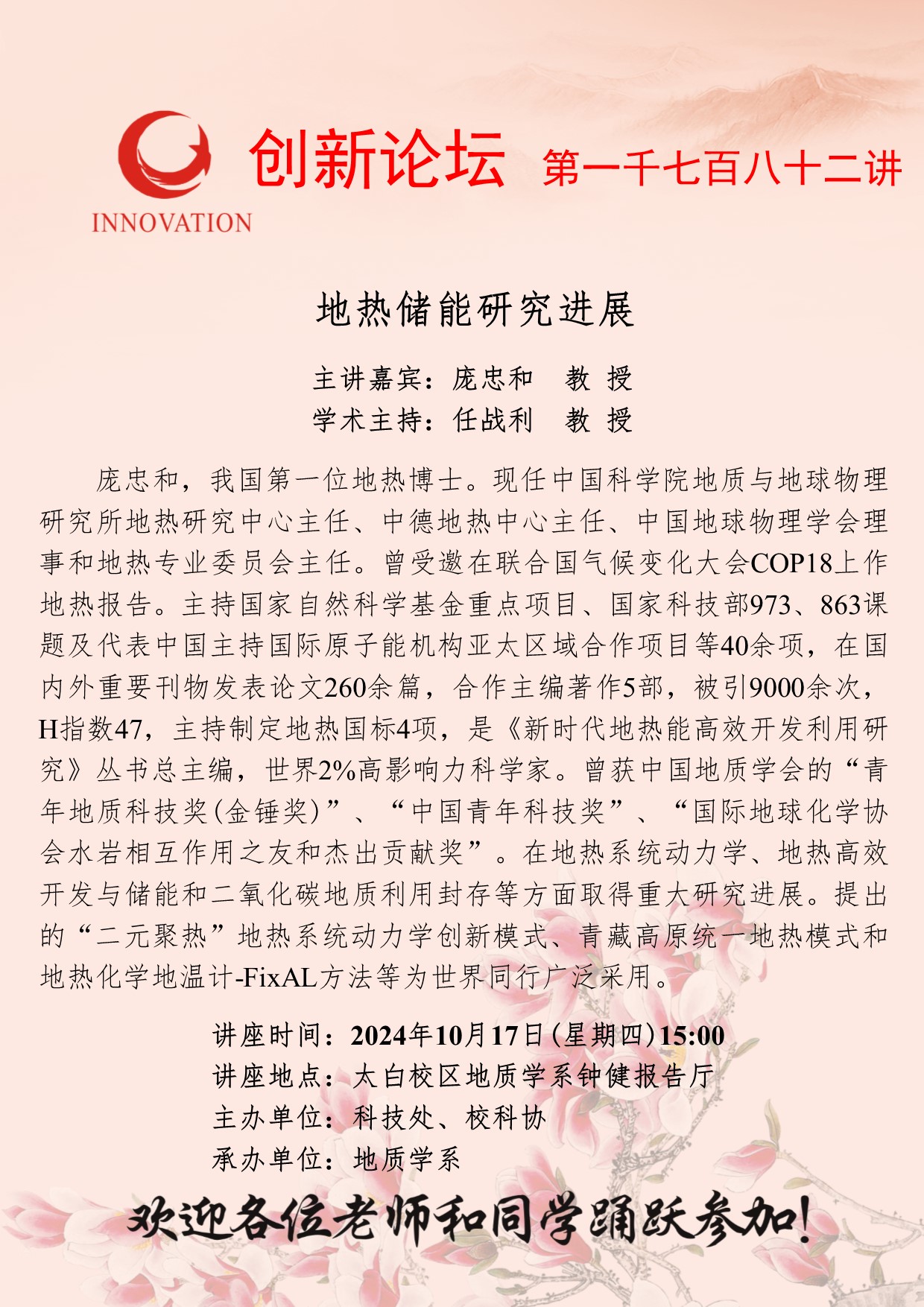 庞忠和 教授 welcome欢迎光临威尼斯集团创新论坛第一千七百八十二讲:地热储能研究进展 讲座时间 2024年10月17日(星期四)15:00 讲座地点 太白校区地质学系钟健报告厅 讲座人介绍 庞忠和 教授 讲座内容