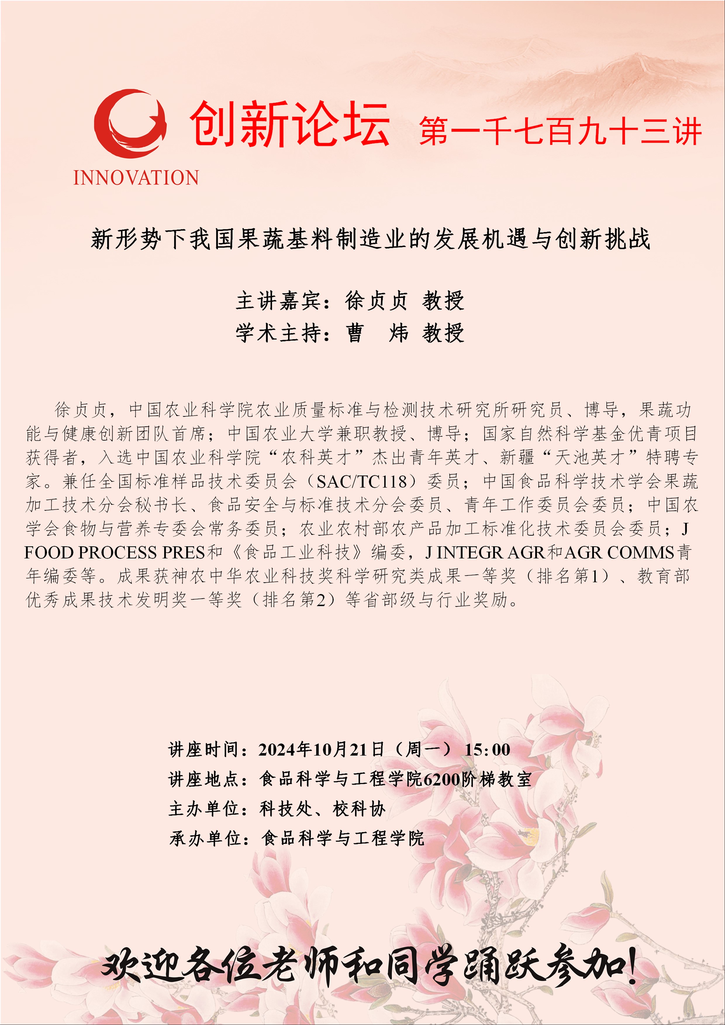 徐贞贞 教授 welcome欢迎光临威尼斯集团创新论坛第一千七百九十三讲: 新形势下我国果蔬基料制造业的发展机遇与创新挑战 讲座时间 2024年10月21日(星期一)15:00 讲座地点 太白校区食品科学与工程学院6200阶梯教室 讲座人介绍 徐贞贞 教授 讲座内容