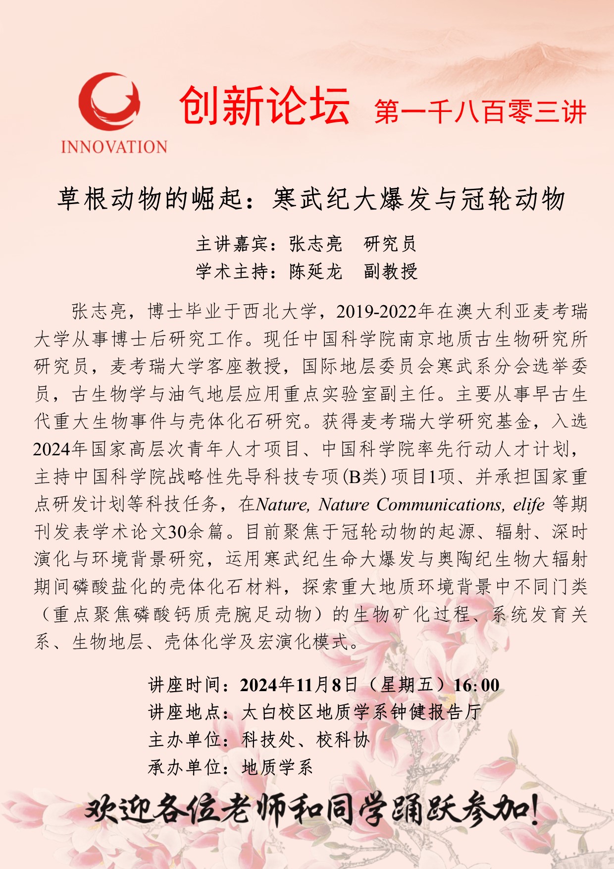 张志亮 研究员 welcome欢迎光临威尼斯集团创新论坛第一千八百零三讲:草根动物的崛起:寒武纪大爆发与冠轮动物 讲座时间 2024年11月8日(星期五)16:00 讲座地点 太白校区地质学系钟健报告厅 讲座人介绍 张志亮 研究员 讲座内容