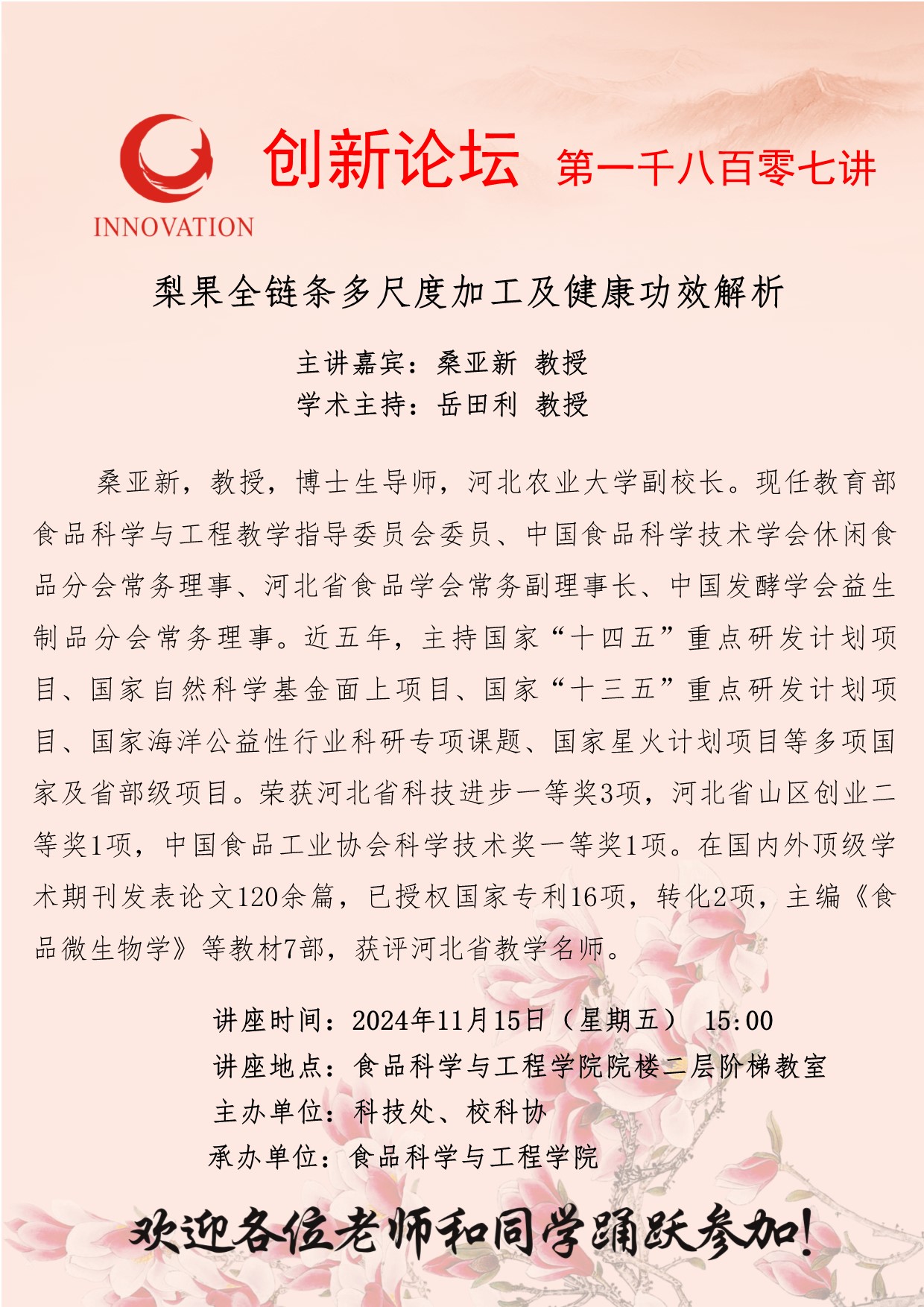桑亚新 教授 welcome欢迎光临威尼斯集团创新论坛第一千八百零七讲: 梨果全链条多尺度加工及健康功效解析 讲座时间 2024年11月15日(星期五) 15:00 讲座地点 食品科学与工程学院院楼二层阶梯教室 讲座人介绍 桑亚新 教授 讲座内容