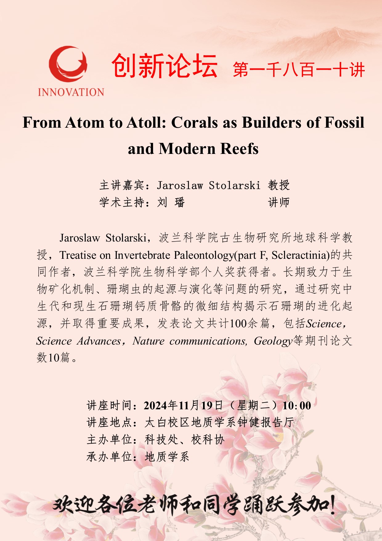 Jaroslaw Stolarski 教授 welcome欢迎光临威尼斯集团创新论坛第一千八百一十讲:From Atom to Atoll: Corals as Builders of Fossil and Modern Reefs 讲座时间 2024年11月19日(星期二)10:00 讲座地点 太白校区地质学系钟健报告厅 讲座人介绍 Jaroslaw Stolarski 教授 讲座内容