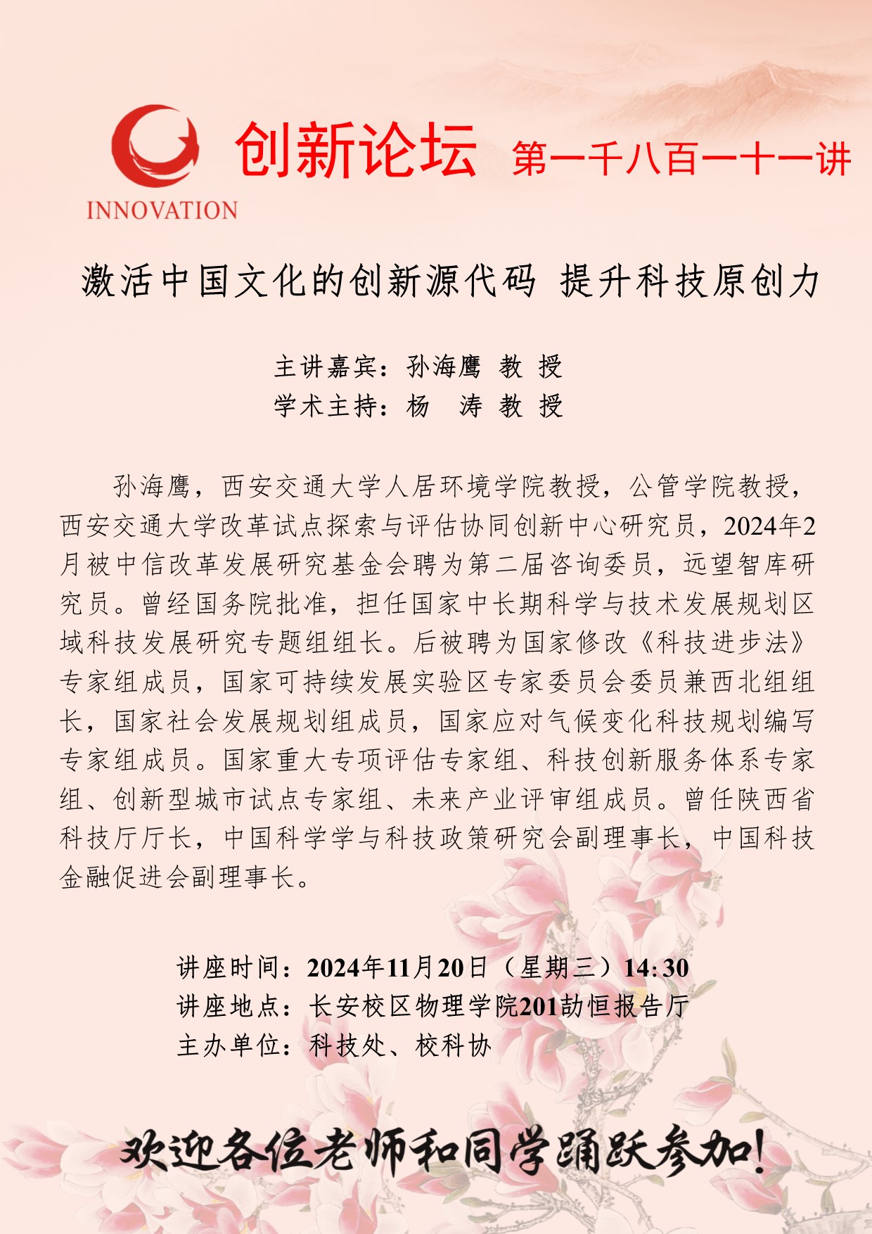孙海鹰 教授 welcome欢迎光临威尼斯集团创新论坛第一千八百一十一讲:激活中国文化的创新源代码 提升科技原创力 讲座时间 2024年11月20日(星期三)14:30 讲座地点 长安校区物理学院201劼恒报告厅 讲座人介绍 孙海鹰 教授 讲座内容