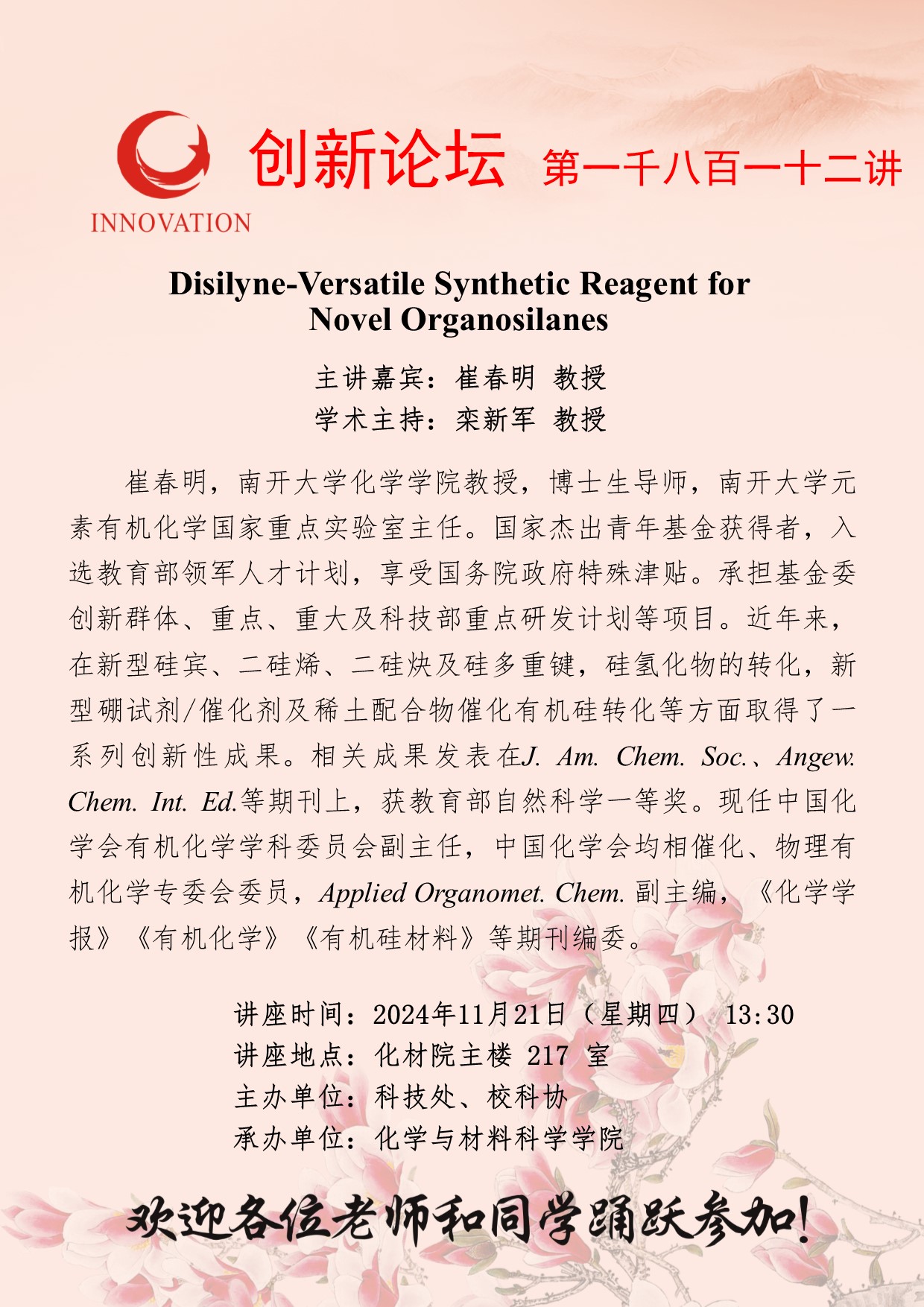 崔春明 教授 welcome欢迎光临威尼斯集团创新论坛第一千八百一十二讲:Disilyne-Versatile Synthetic Reagent for 讲座时间 2024年11月21日(星期四) 13:30 讲座地点 化材院主楼 217 室 讲座人介绍 崔春明 教授 讲座内容