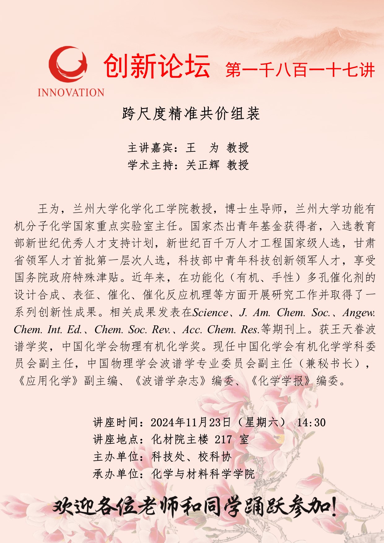 王为 教授 welcome欢迎光临威尼斯集团创新论坛第一千八百一十七讲:跨尺度精准共价组装 讲座时间 2024年11月23日(星期六) 14:30 讲座地点 化材院主楼 217 室 讲座人介绍 王为 教授 讲座内容