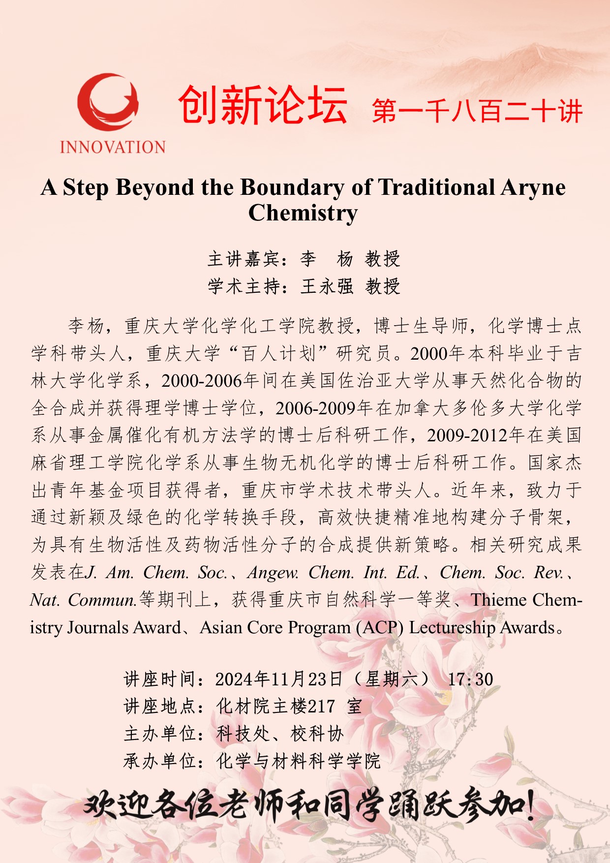 李杨 教授 welcome欢迎光临威尼斯集团创新论坛第一千八百二十讲:A Step Beyond the Boundary of Traditional Aryne Chemistry 讲座时间 2024年11月23日(星期六) 17:30 讲座地点 化材院主楼217室 讲座人介绍 李杨 教授 讲座内容