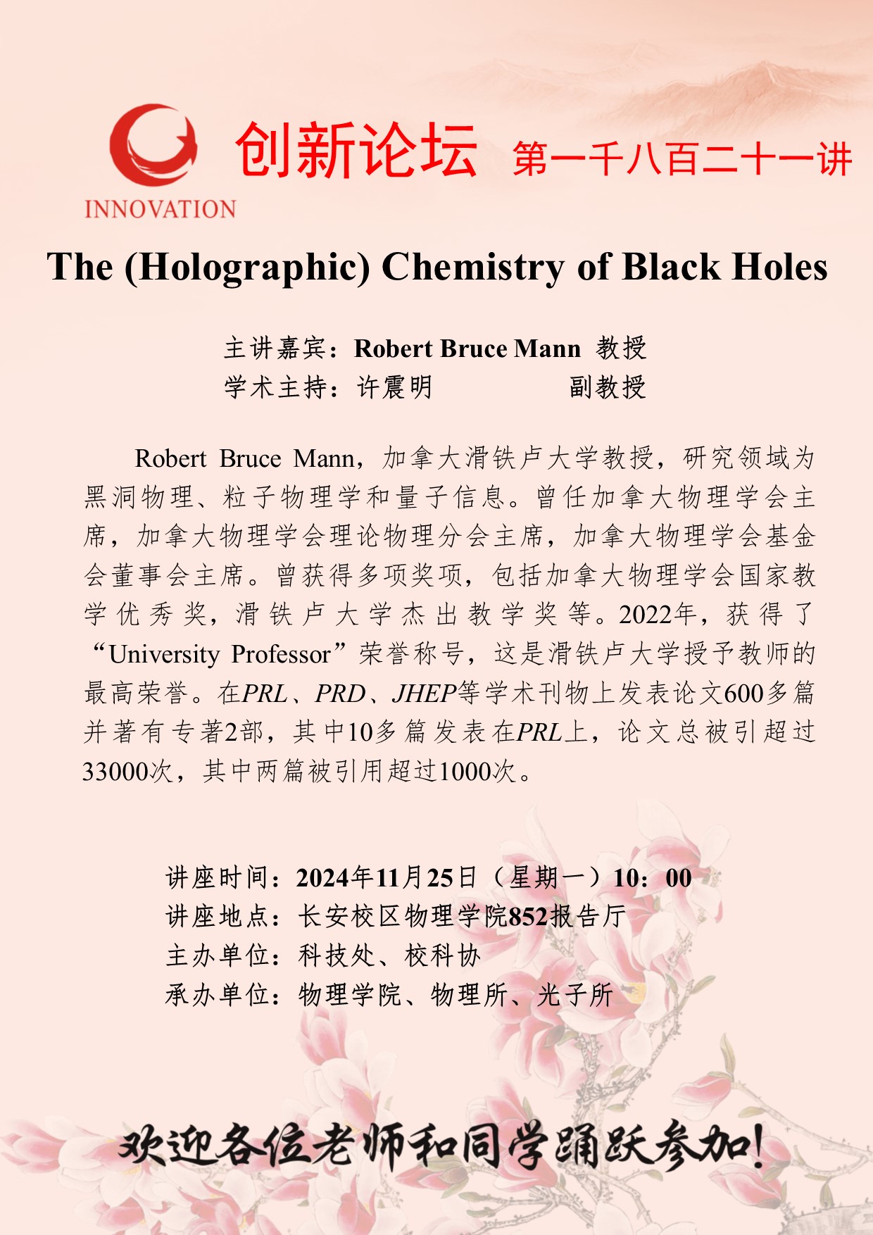 Robert Bruce Mann 教授 welcome欢迎光临威尼斯集团创新论坛第一千八百二十一讲:The (Holographic) Chemistry of Black Holes 讲座时间 2024年11月25日(星期一)10:00 讲座地点 长安校区物理学院852报告厅 讲座人介绍 Robert Bruce Mann 教授 讲座内容