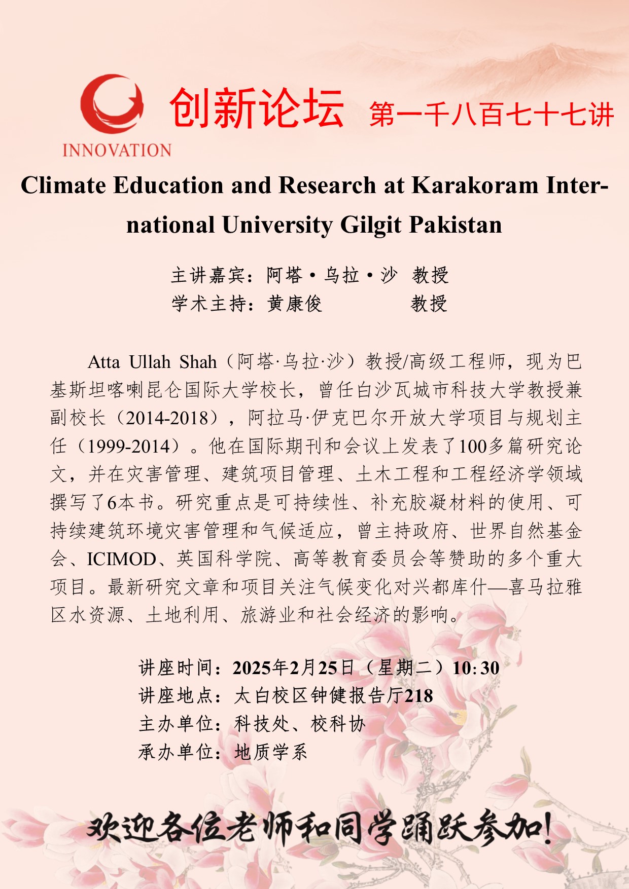 阿塔·乌拉·沙 教授 welcome欢迎光临威尼斯集团创新论坛第一千八百七十七讲:Climate Education and Research at Karakoram International University Gilgit Pakistan 讲座时间 2025年2月25日(星期二)10:30 讲座地点 太白校区钟健报告厅218 讲座人介绍 阿塔·乌拉·沙 教授 讲座内容