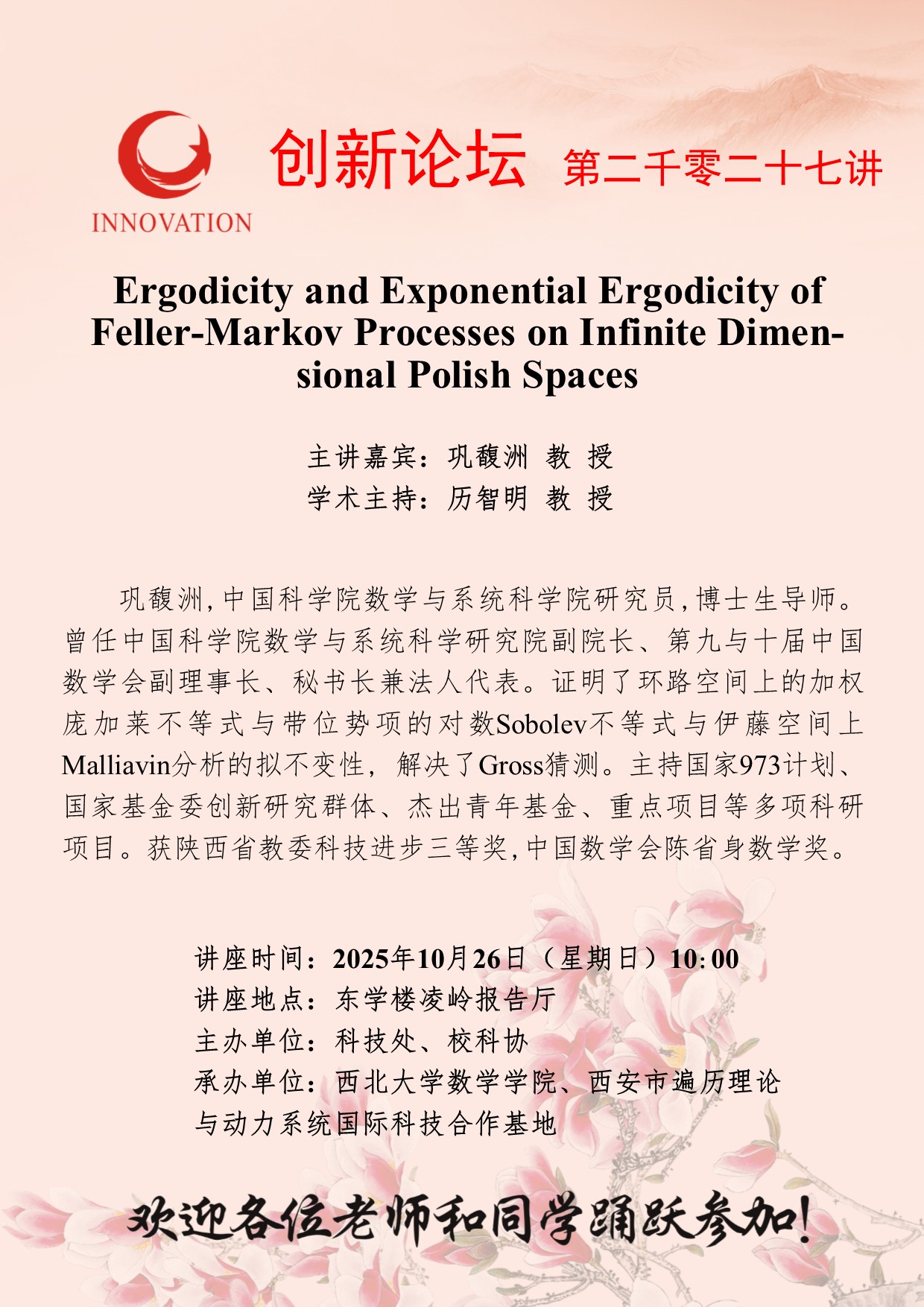 巩馥洲 教 授 welcome欢迎光临威尼斯集团创新论坛第二千零二十七讲:Ergodicity and Exponential Ergodicity of Feller-Markov Processes on Infinite Dimensional Polish Spaces 讲座时间 2025年10月26日(星期日)10:00 讲座地点 东学楼凌岭报告厅 讲座人介绍 巩馥洲 教 授 讲座内容