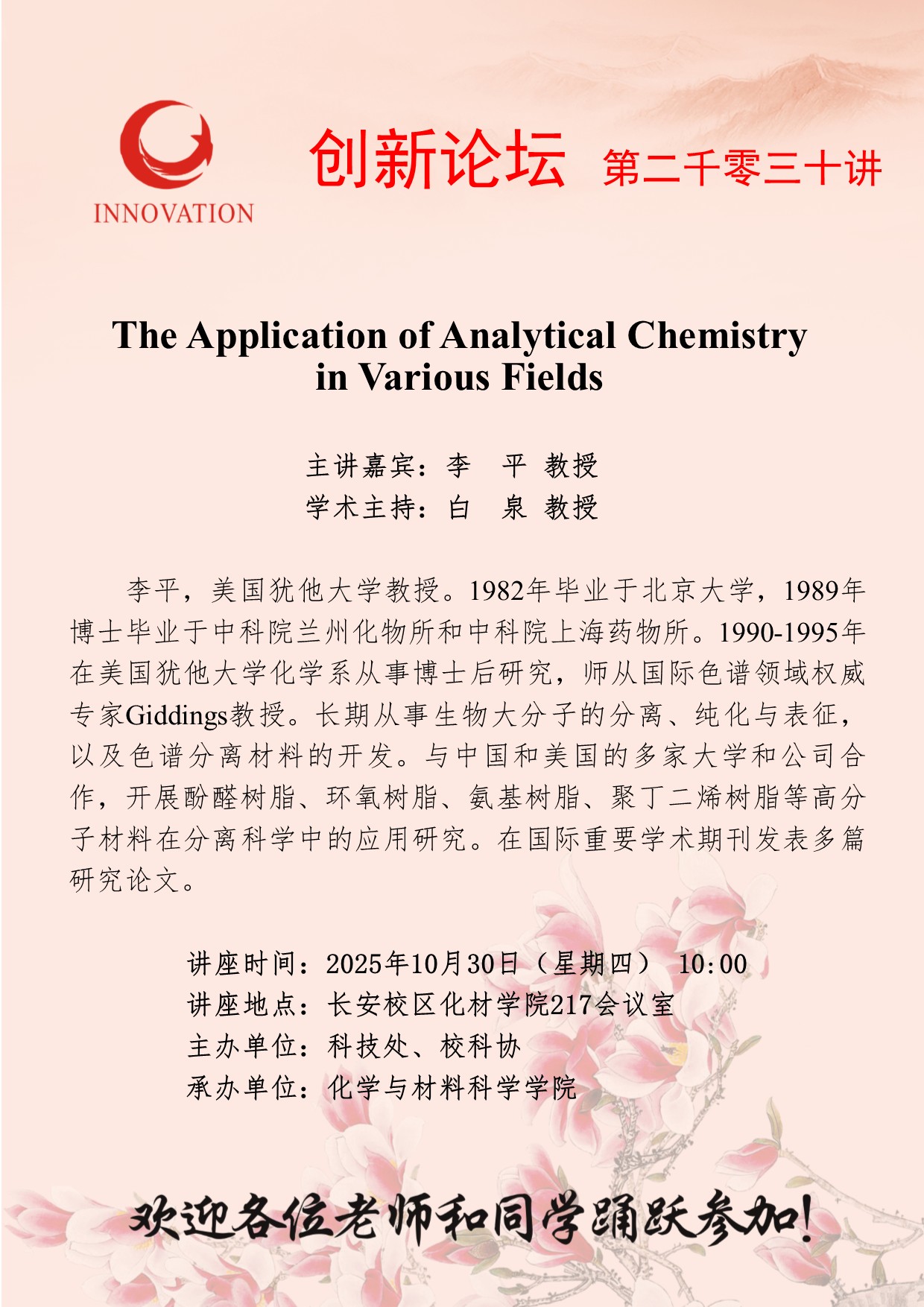 李 平 教授 welcome欢迎光临威尼斯集团创新论坛第二千零三十讲:The Application of Analytical Chemistry in Various Fields 讲座时间 2025年10月30日(星期四) 10:00 讲座地点 长安校区化材学院217会议室 讲座人介绍 李 平 教授 讲座内容