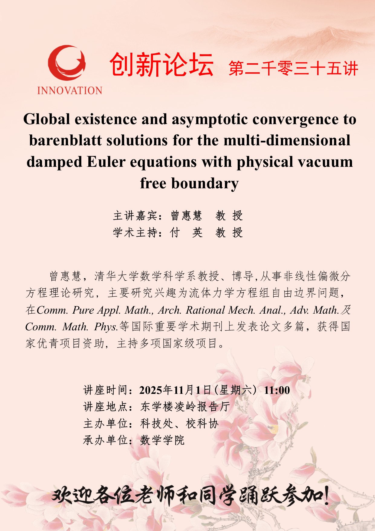 曾惠慧 教 授 welcome欢迎光临威尼斯集团创新论坛第二千零三十五讲:Global existence and asymptotic convergence to barenblatt solutions for the multi-dimensional damped Euler equations with physical vacuum free boundary 讲座时间 2025年11月1日(星期六) 11:00 讲座地点 东学楼凌岭报告厅 讲座人介绍 曾惠慧 教 授 讲座内容