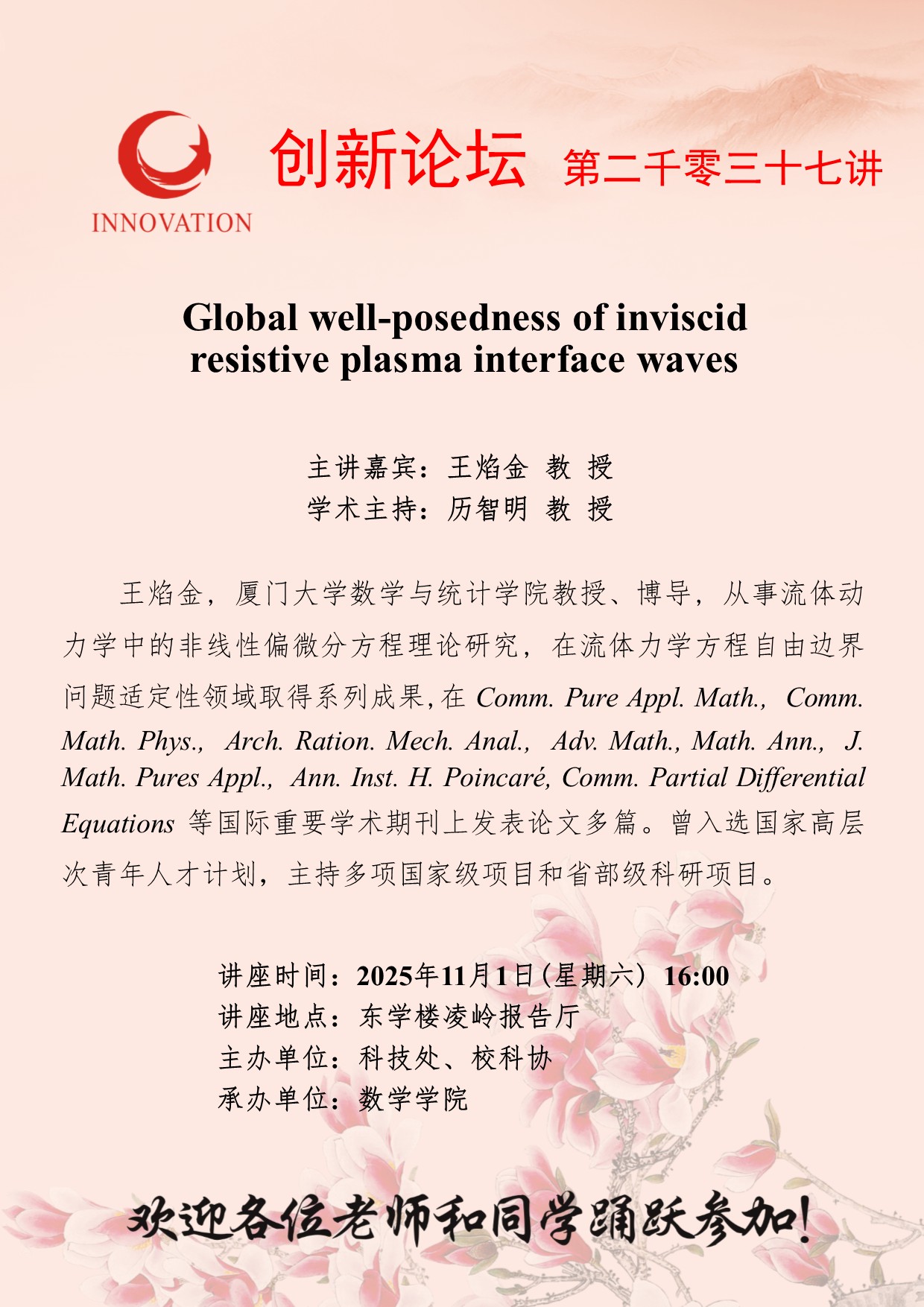 王焰金 教 授 welcome欢迎光临威尼斯集团创新论坛第二千零三十七讲:Global well-posedness of inviscid resistive plasma interface waves 讲座时间 2025年11月1日(星期六) 16:00 讲座地点 东学楼凌岭报告厅 讲座人介绍 王焰金 教 授 讲座内容
