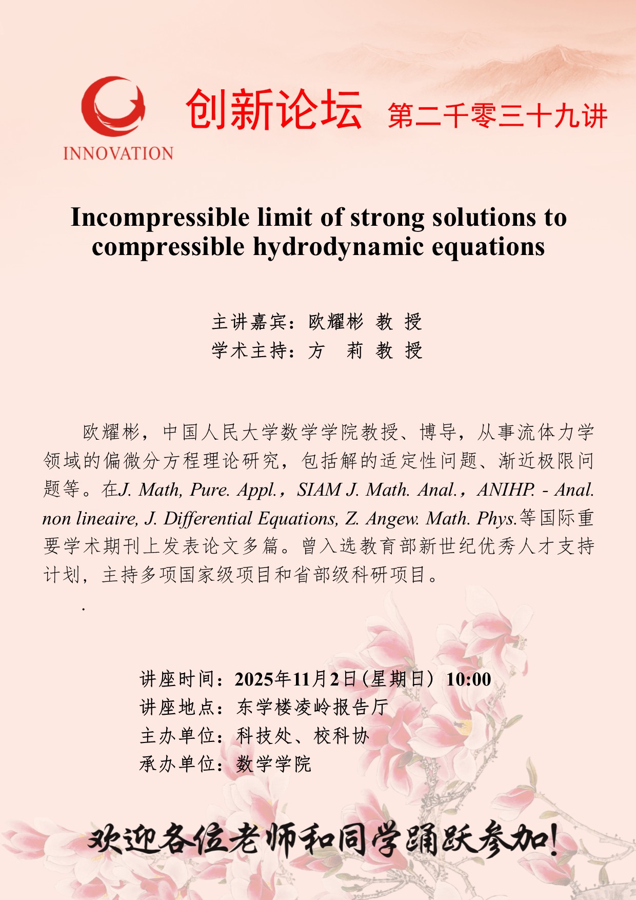 欧耀彬 教 授 welcome欢迎光临威尼斯集团创新论坛第二千零三十九讲:Incompressible limit of strong solutions to compressible hydrodynamic equations 讲座时间 2025年11月2日(星期日) 10:00 讲座地点 东学楼凌岭报告厅 讲座人介绍 欧耀彬 教 授 讲座内容
