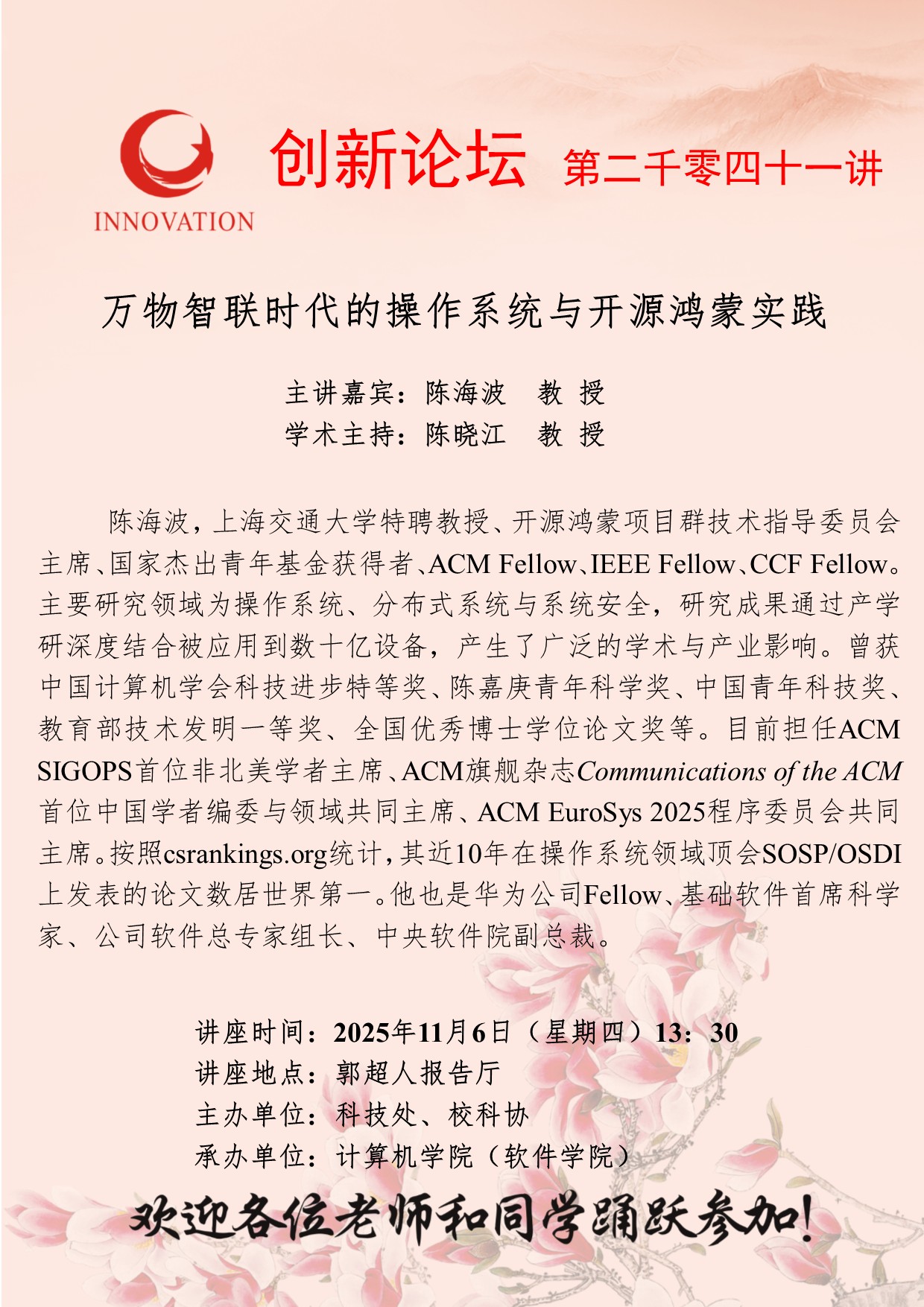 陈海波 教授 welcome欢迎光临威尼斯集团创新论坛第二千零四十一讲:万物智联时代的操作系统与开源鸿蒙实践 讲座时间 2025年11月6日(星期四)13:30 讲座地点 郭超人报告厅 讲座人介绍 陈海波 教授 讲座内容
