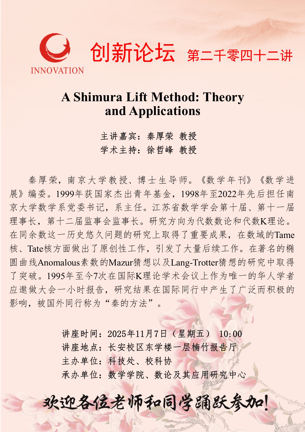秦厚荣 教授 welcome欢迎光临威尼斯集团创新论坛第二千零四十二讲:A Shimura Lift Method: Theory and Applications 讲座时间 2025年11月7日(星期五) 10:00 讲座地点 长安校区东学楼一层楠竹报告厅 讲座人介绍 秦厚荣 教授 讲座内容