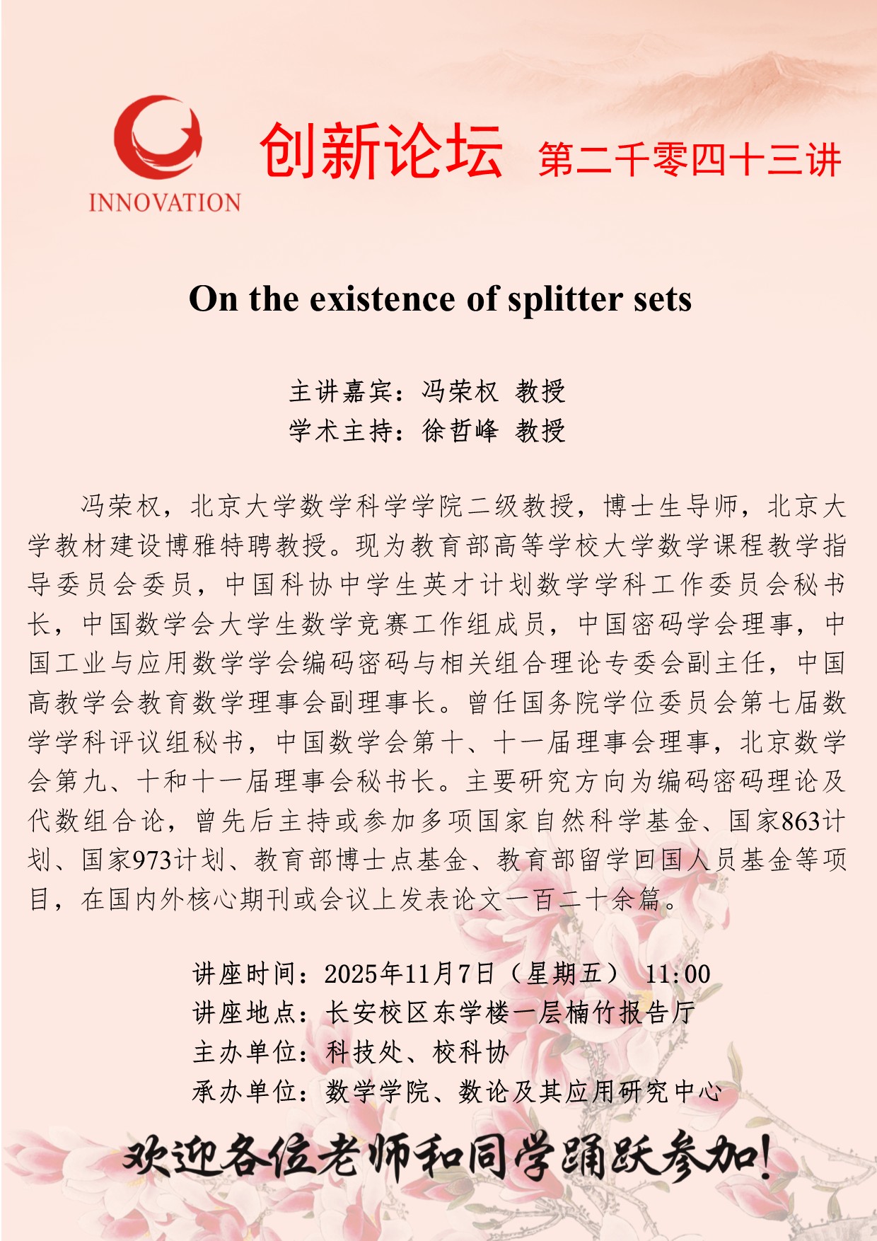 冯荣权 教授 welcome欢迎光临威尼斯集团创新论坛第二千零四十三讲:On the existence of splitter sets 讲座时间 2025年11月7日(星期五) 11:00 讲座地点 长安校区东学楼一层楠竹报告厅 讲座人介绍 冯荣权 教授 讲座内容