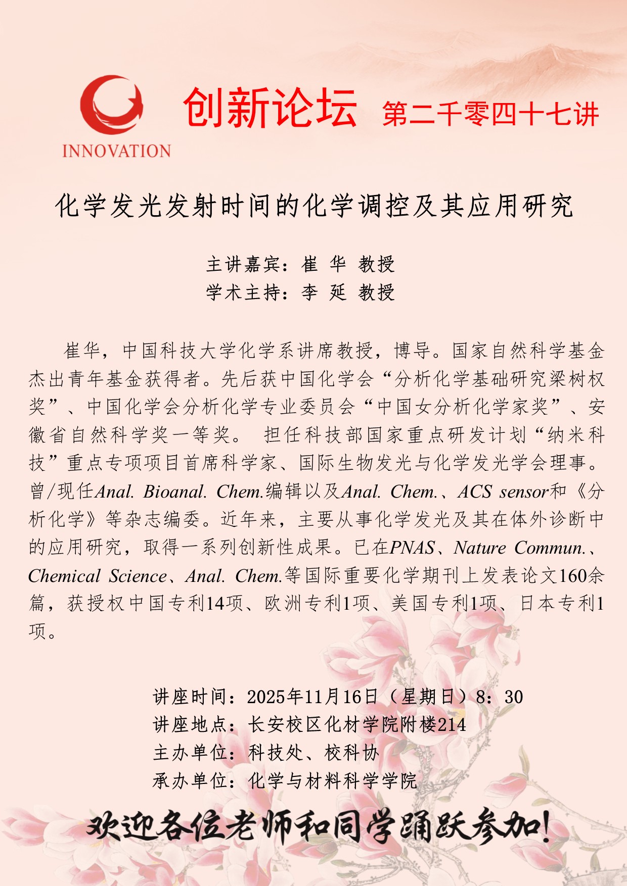 崔华 教授 welcome欢迎光临威尼斯集团创新论坛第二千零四十七讲:化学发光发射时间的化学调控及其应用研究 讲座时间 2025年11月16日(星期日)8:30 讲座地点 长安校区化材学院附楼214 讲座人介绍 崔华 教授 讲座内容