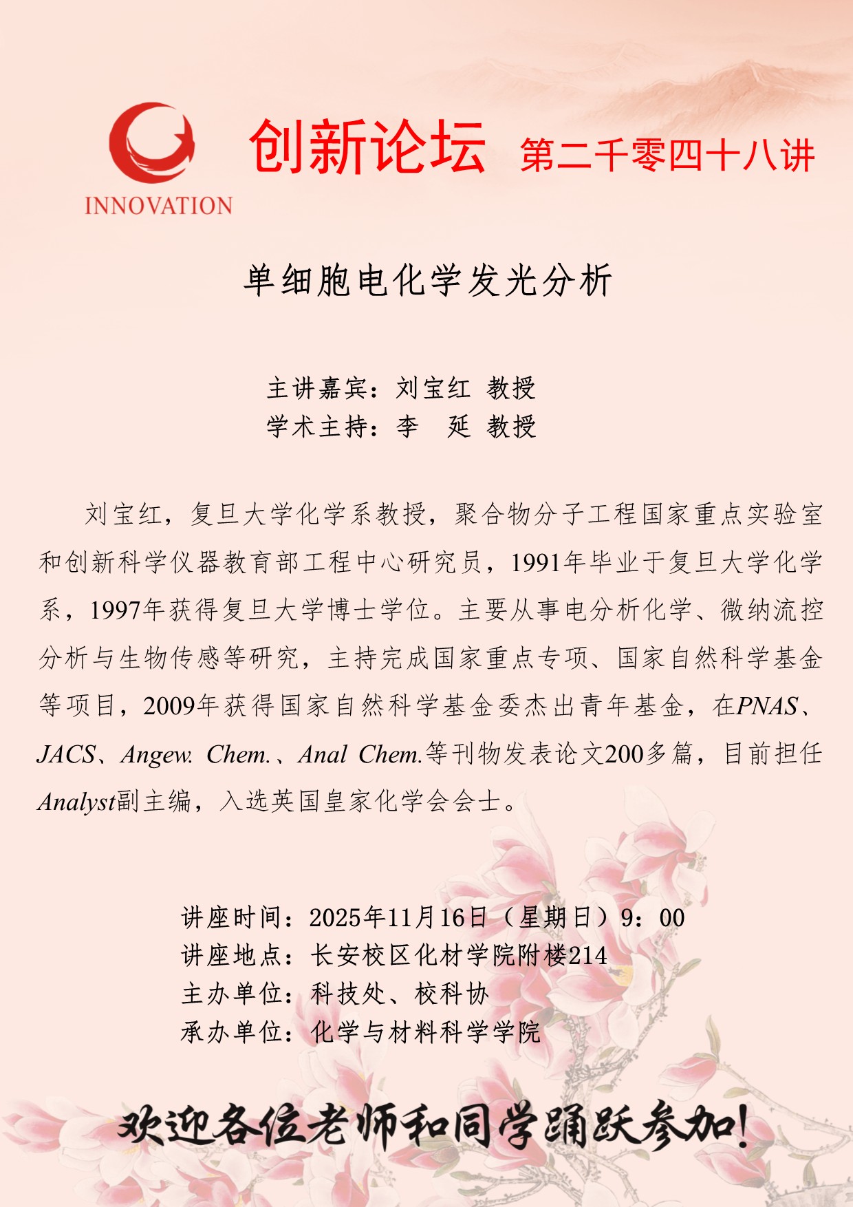刘宝红 教授 welcome欢迎光临威尼斯集团创新论坛第二千零四十八讲:单细胞电化学发光分析 讲座时间 2025年11月16日(星期日)9:00 讲座地点 长安校区化材学院附楼214 讲座人介绍 刘宝红 教授 讲座内容
