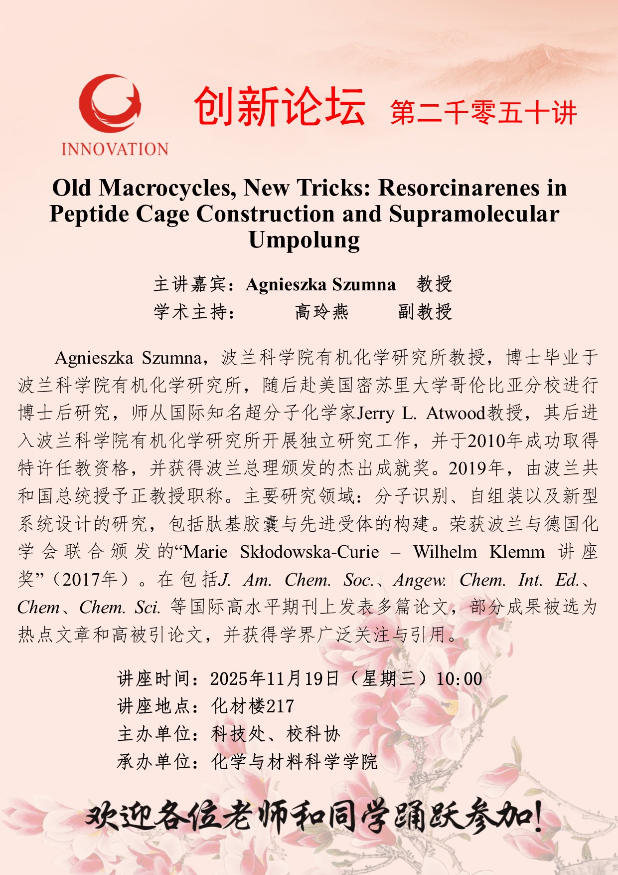 Agnieszka Szumna 教授 welcome欢迎光临威尼斯集团创新论坛第二千零五十讲:Old Macrocycles, New Tricks: Resorcinarenes in Peptide Cage Construction and Supramolecular Umpolung 讲座时间 2025年11月19日(星期三)10:00 讲座地点 化材楼217 讲座人介绍 Agnieszka Szumna 教授 讲座内容