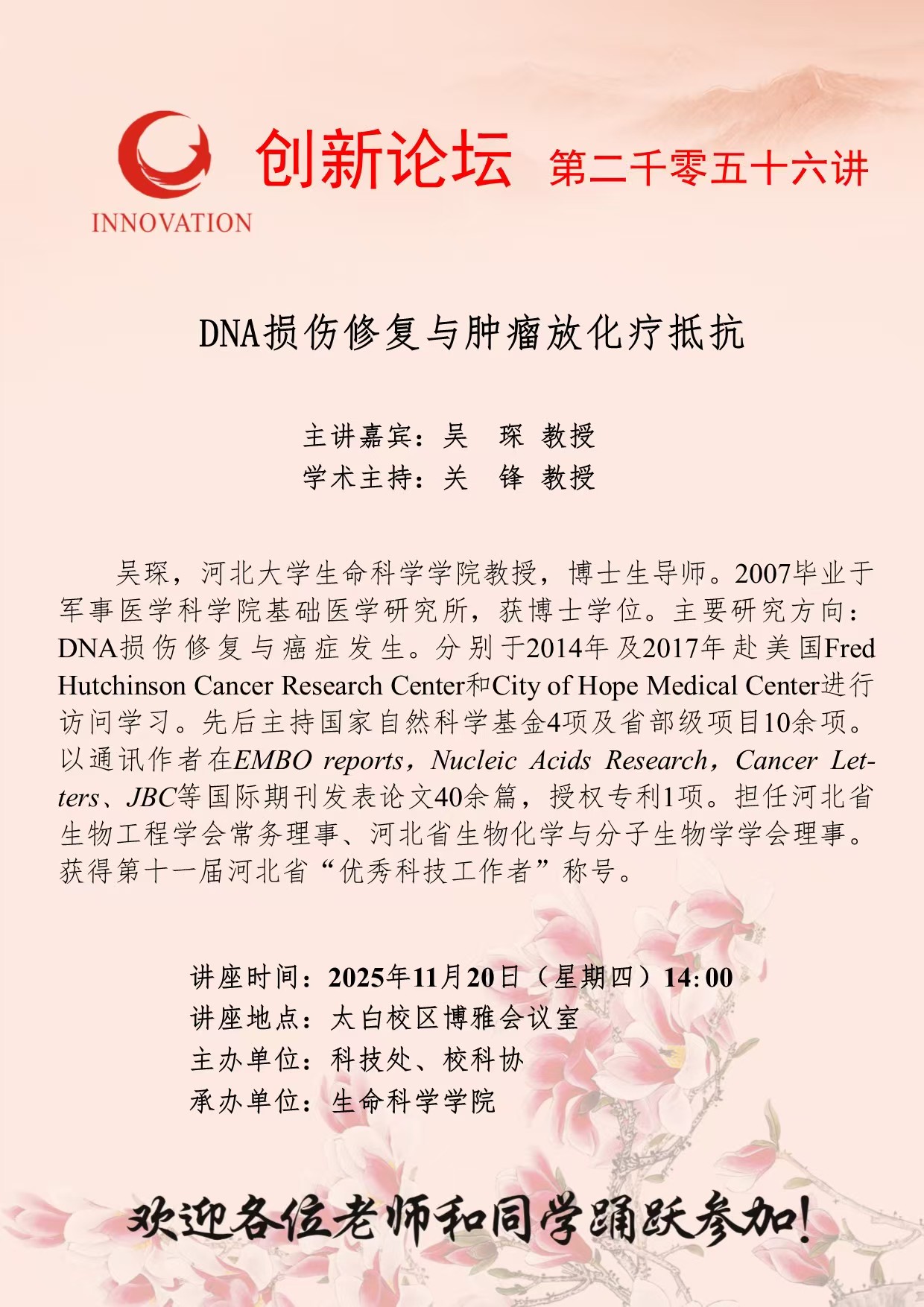 吴琛 教授 welcome欢迎光临威尼斯集团创新论坛第二千零五十六讲:DNA损伤修复与肿瘤放化疗抵抗 讲座时间 2025年11月20日(星期四)14:00 讲座地点 太白校区博雅会议室 讲座人介绍 吴琛 教授 讲座内容