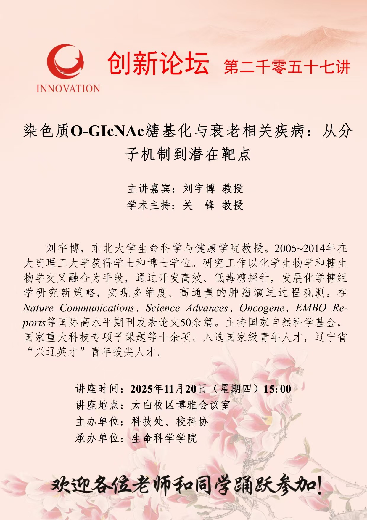 刘宇博 教授 welcome欢迎光临威尼斯集团创新论坛第二千零五十七讲:染色质O-GIcNAc糖基化与衰老相关疾病:从分子机制到潜在靶点 讲座时间 2025年11月20日(星期四)15:00 讲座地点 太白校区博雅会议室 讲座人介绍 刘宇博 教授 讲座内容