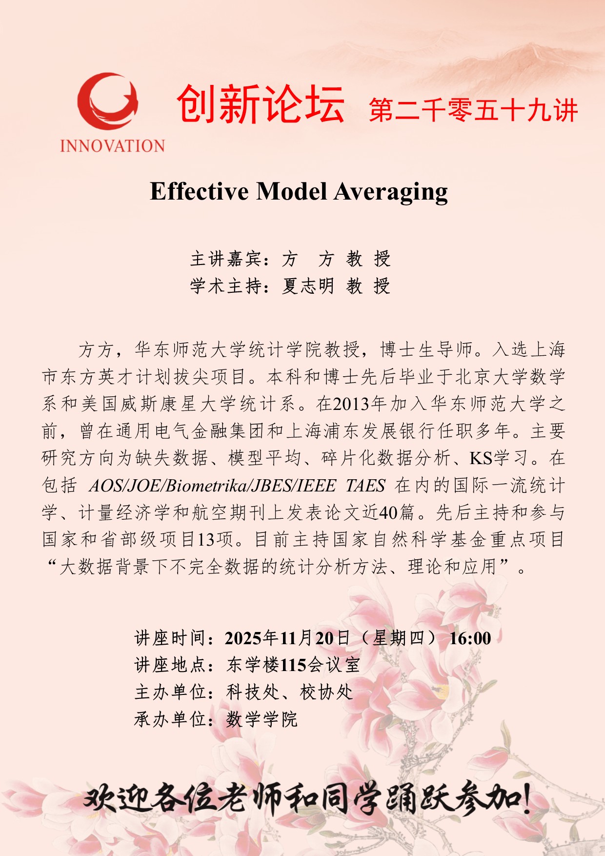 方方 教授 welcome欢迎光临威尼斯集团创新论坛第二千零五十九讲:Effective Model Averaging 讲座时间 2025年11月20日(星期四) 16:00 讲座地点 东学楼115会议室 讲座人介绍 方方 教授 讲座内容