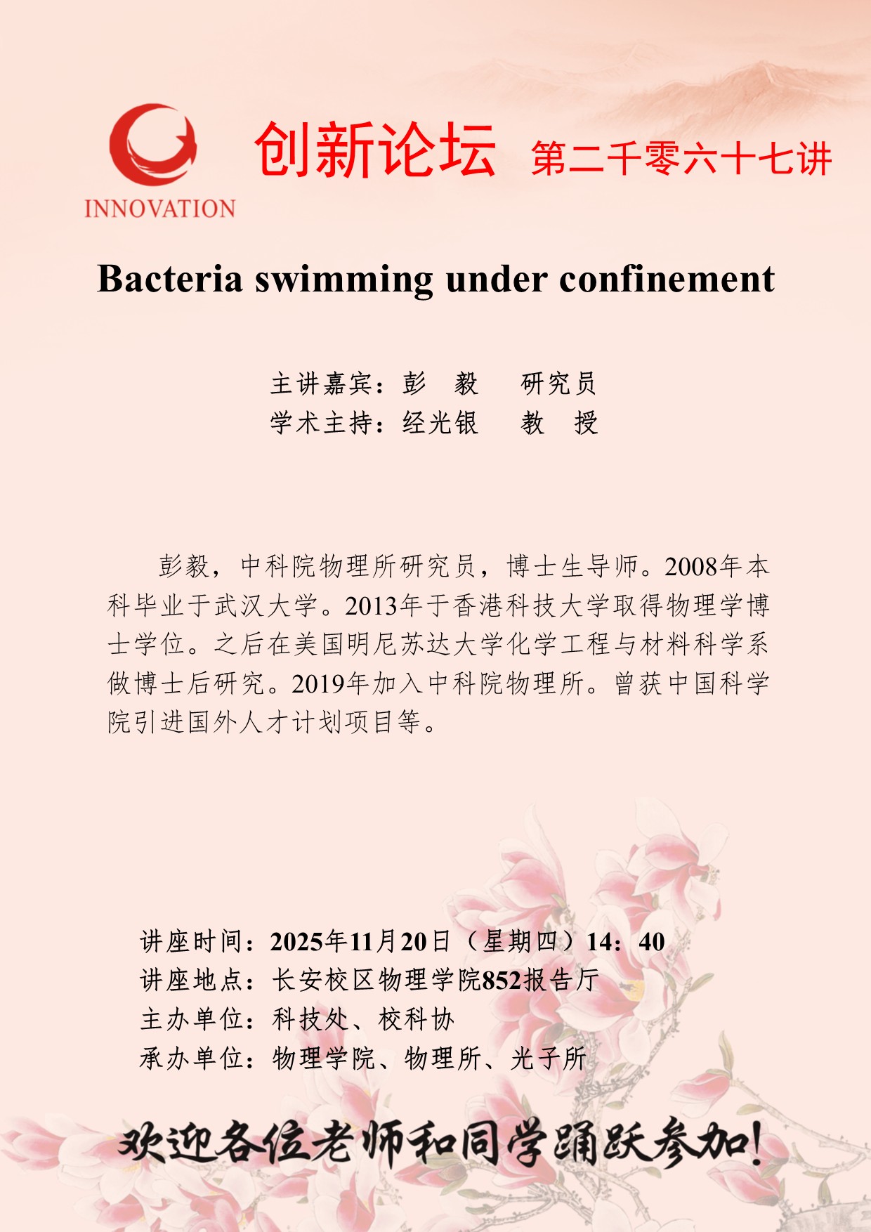 彭毅 研究员 welcome欢迎光临威尼斯集团创新论坛第二千零六十七讲:Bacteria swimming under confinement 讲座时间 2025年11月20日(星期四)14:40 讲座地点 长安校区物理学院852报告厅 讲座人介绍 彭毅 研究员 讲座内容