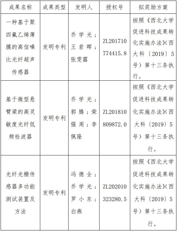 按照《welcome欢迎光临威尼斯集团促进科技成果转化实施办法》(西大科〔2019〕5号)相关规定,拟对威尼斯官网物理学院乔学光教授作为成果负责人的3项发明专利权实施普通许可,现将相关信息公示如下:
