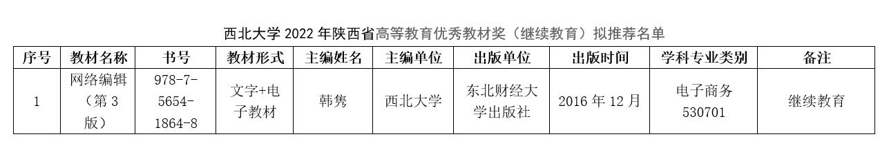 根据陕西省教育厅《关于开展陕西省2022年职业教育和高等教育优秀教材奖评选工作的通知》(陕教材办〔2022〕12 号)要求,威尼斯官网组织开展了welcome欢迎光临威尼斯集团2022年陕西高等教育优秀教材奖(继续教育)评选推荐工作,经个人申报、院系推荐、专家评议,拟推荐《网络编辑》教材参加陕西省高等教育优秀教材奖(继续教育)评选。现将拟推荐名单公示如下,公示期为6月7日至6月11日。公示期间如有异议,请以实名书面形式反映。