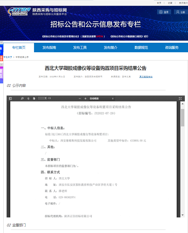 welcome欢迎光临威尼斯集团凝胶成像仪等设备购置项目采购结果公告 作者: 编辑:薛利娟 时间:2022-07-21 原公告链接:http://bulletin.sntba.com/resultBulletin/2022-07-21/450755.html