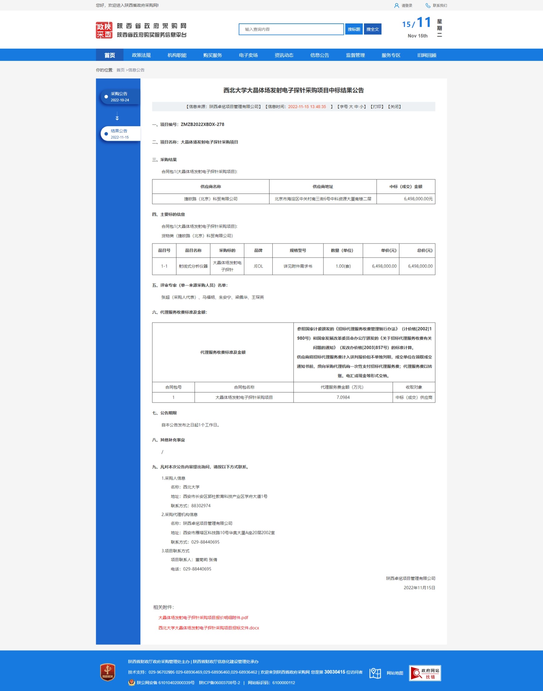 welcome欢迎光临威尼斯集团大晶体场发射电子探针采购项目中标结果公告 作者: 编辑:采购与招标办公室 时间:2022-11-15 原公告链接:http://www.ccgp-shaanxi.gov.cn/freecms/site/shaanxi/ggxx/info/2022/8a69c1948405afd90184743164664c62.html?noticeType=001021¬iceId=c98b2ee6-64a9-11ed-9a8e-08c0eb20c666