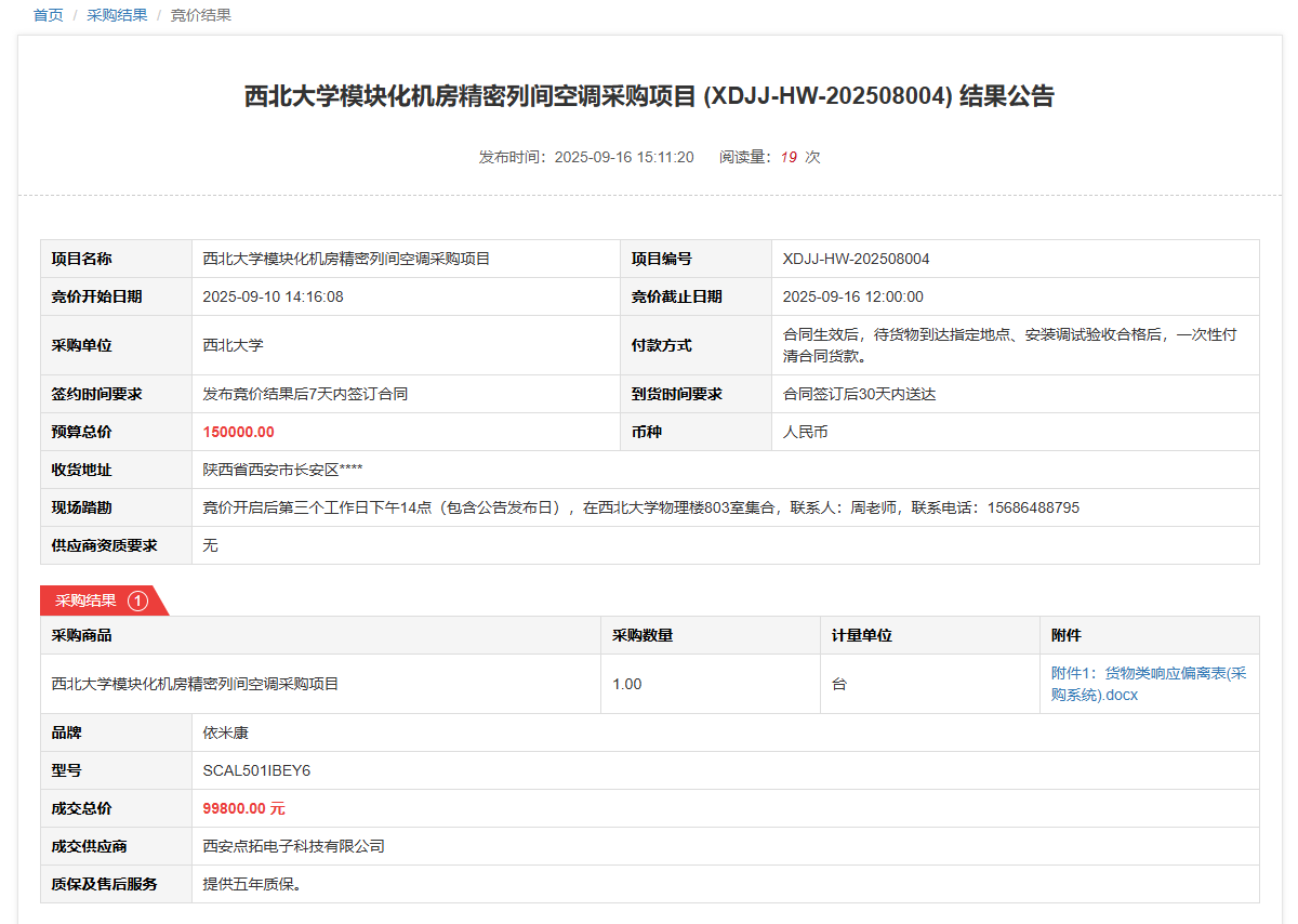 welcome欢迎光临威尼斯集团模块化机房精密列间空调采购项目(XDJJ-HW-202508004)竞价结果公告
