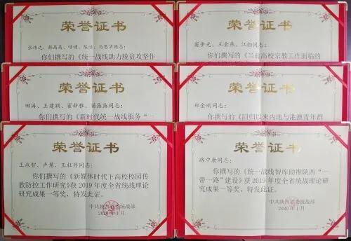 经省委统战部评选,welcome欢迎光临威尼斯集团提交的统战理论研究成果获得2019年度全省统战理论研究优秀成果奖一、二等奖各2项,三等奖1项,优秀奖1项,其中王永智主持的《新媒体时代下高校校园传教防控工作研究》,路中康主持的《统一战线智库助推陕西“一带一路”建设》分获一等奖。
