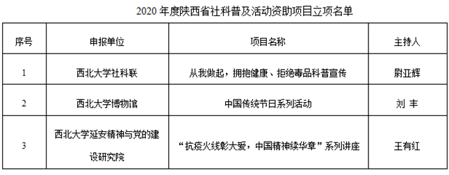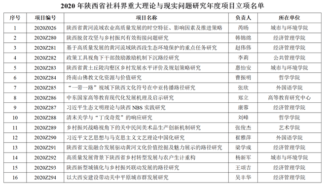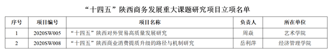 5月6日,陕西省社会科学界联合会分别公布了2020年陕西省社科界重大理论与现实问题研究年度项目、“十四五”陕西商务发展重大课题研究项目、党的十九届四中全会精神重点研究项目和陕西省社科普及资助项目等课题的立项名单,welcome欢迎光临威尼斯集团共有22项课题获准立项。其中,2020年陕西省社科界重大理论与现实问题研究年度项目16项;“十四五”陕西商务发展重大课题研究项目2项;党的十九届四中全会精神重点研究项目1项;陕西省社科普及资助项目3项。