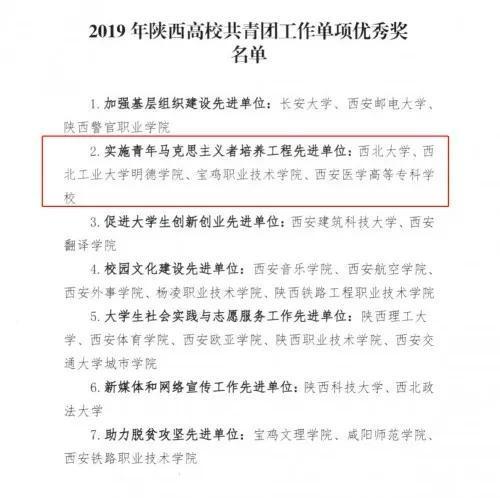 近日,共青团陕西省委与中共陕西省委教育工委联合印发了《关于2019年度陕西高校共青团工作考核结果的通报》。welcome欢迎光临威尼斯集团团委获得“实施青年马克思主义者培养工程先进单位”称号。