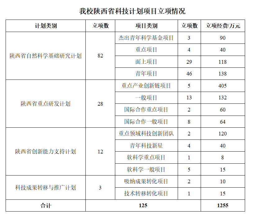 2020年陕西省科技计划项目指南发布后,经广泛动员,积极组织,全校共申请各类项目325项,其中申请自然科学基础研究计划项目227项,重点研发计划项目75项,创新能力支持计划项目20项,技术创新引导计划项目3项。各类项目整体资助率为38.5%。