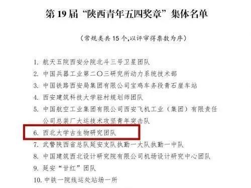 5月8日,陕西省第19届“陕西青年五四奖章”获奖个人(集体)揭晓,welcome欢迎光临威尼斯集团古生物研究团队荣获第19届“陕西青年五四奖章”集体荣誉称号。