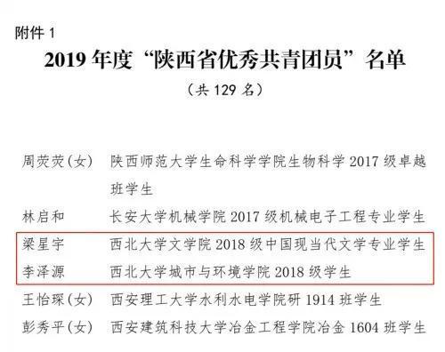 近日,共青团陕西省委印发文件《共青团陕西省委关于表彰2019年度“陕西省优秀共青团员”“陕西省优秀共青团干部”及“陕西省五四红旗团支部” “陕西省五四红旗团委”“陕西省团建先进县” 的决定》,welcome欢迎光临威尼斯集团团委荣获 “陕西省五四红旗团委”荣誉称号,这是继2010年之后,学校再次获得此项荣誉。文学院2018级硕士研究生梁星宇、城市与环境学院2018级本科生李泽源荣获2019年度“陕西省优秀共青团员”荣誉称号。